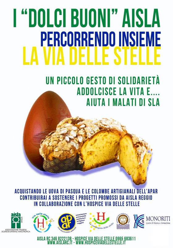 Il Centro Monoriti, l’Hospice “Via delle stelle", l'AISLA e l'Università Mediterranea di Reggio Calabria, con la collaborazione di moltissimi enti, associazioni e volontari, promuovono la V edizione del progetto di beneficenza “Percorrendo insieme la via delle stelle” (vendita di uova di Pasqua da 300 gr, 500 gr ed 1 kg al costo di 5, 10 e 15 €).