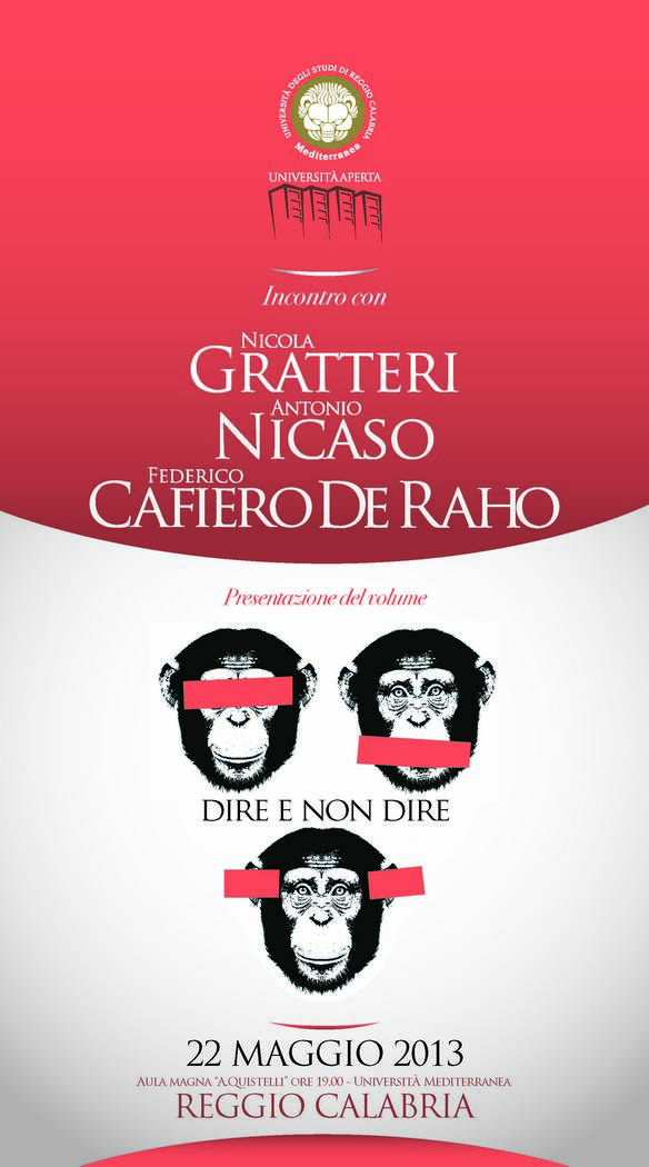 Per Università Aperta appuntamento con Nicola Gratteri, Antonio Nicaso e Federico Cafiero De Raho. Dall'ultimo libro "Dire e non dire", la traccia per un confronto sull'universo 'ndrangheta nello scorcio che intercettazioni, pizzini e confessioni hanno consegnato ai magistrati.