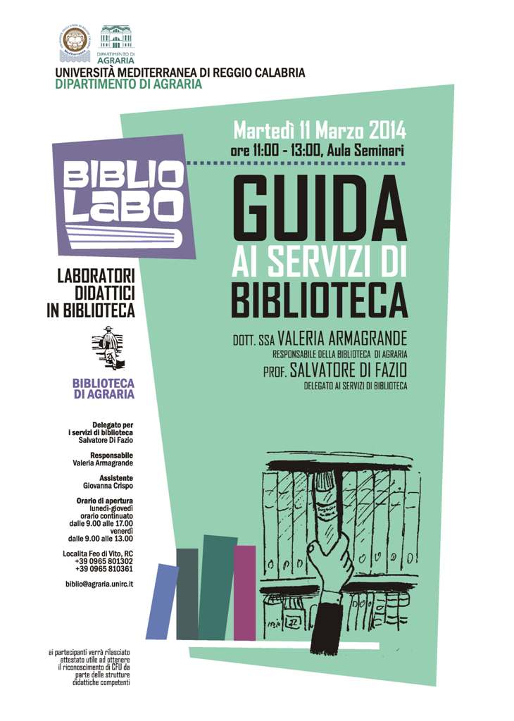 Martedì 11 marzo nell'aula seminari del Dipartimento di Agraria dalle ore 11.00 alle ore 13.00 avrà luogo il seminario di presentazione delle attività, dei servizi e delle risorse della Biblioteca di Agraria. Nel corso dell'incontro verrà presentato il calendario delle prossime iniziative seminariali organizzate dalla biblioteca in svolgimento nel periodo marzo-maggio 2014. Ai partecipanti verrà rilasciato attestato di partecipazione utile ad ottenere il riconoscimento dei CFU da parte delle strutture didattiche competenti.