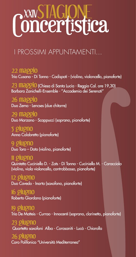 L'Università Mediterranea e il Consevatorio Francesco Cilea presentano la XXIV stagione concertistica che si svolgerà in Aula magna Quistelli secondo il calendario allegato.