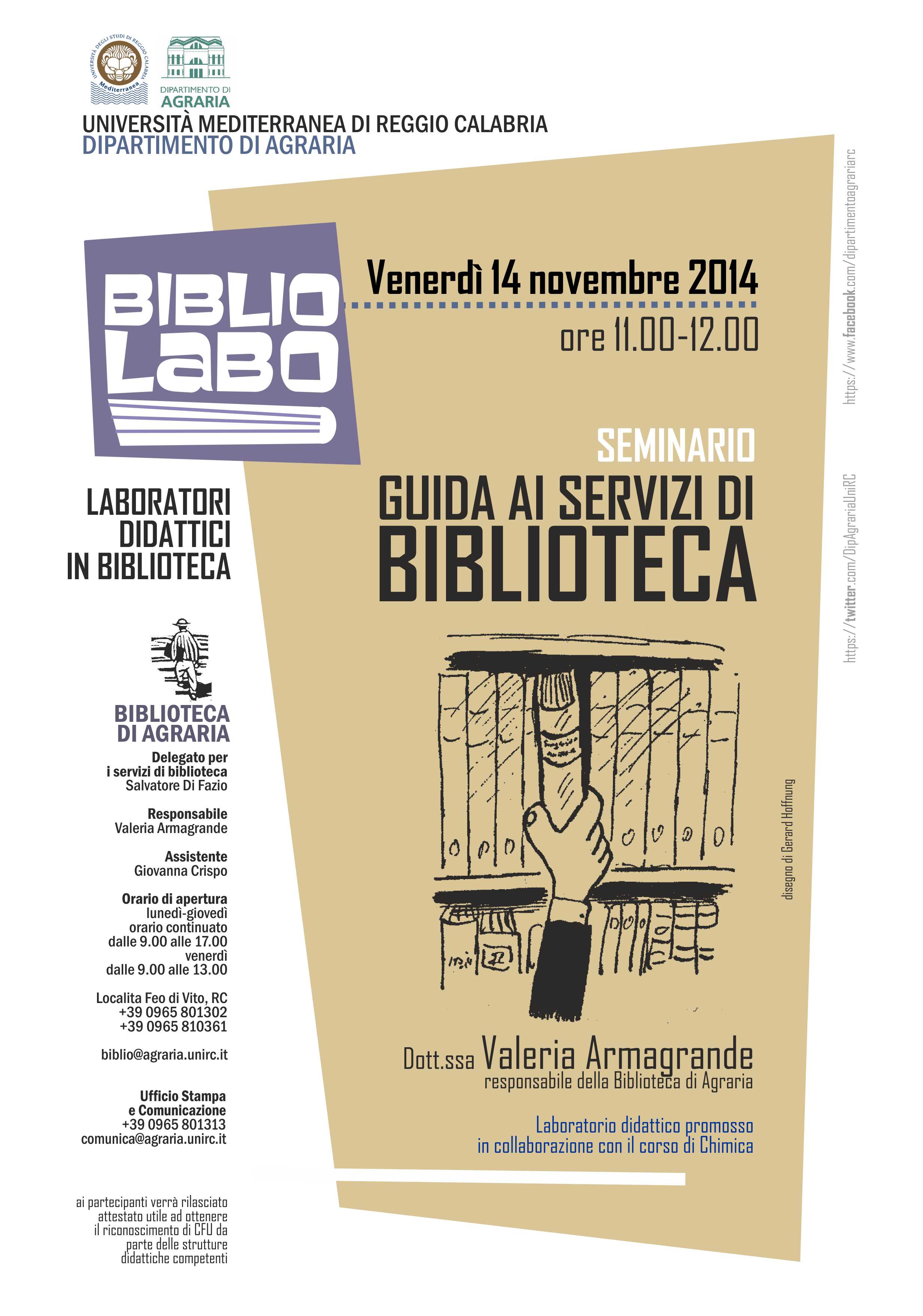 Venerdì 14 novembre dalle ore 11.00 alle ore 12.00 nell’aula seminari del Dipartimento di Agraria, in collaborazione con il corso di Chimica STA e SFA si svolgerà l’incontro con gli studenti iscritti al 1° anno con l’obiettivo di presentare i servizi bibliotecari, con una guida all’uso del catalogo, delle risorse presenti in biblioteca e di quelle accessibili attraverso il più ampio sistema bibliotecario di cui essa è parte integrante, a livello di Ateneo come in ambito regionale e nazionale. La consultazione dei diversi cataloghi on-line sarà approfondita con degli esempi di ricerca riguardanti le monografie, le riviste, le tesi di laurea e le banche dati e con l’analisi dei riferimenti bibliografici proposti. Verranno inoltre illustrate le modalità di iscrizione alla biblioteca, del servizio di prestito, prestito interbibliotecario e fornitura documenti.