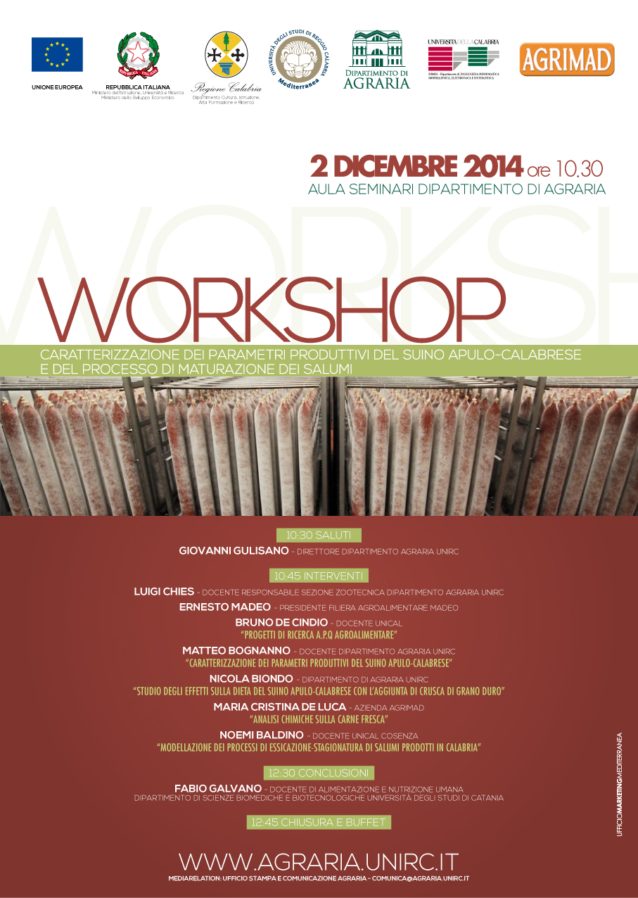 Martedì 02 dicembre alle ore 10.30, presso l’Aula Seminari del Dipartimento di Agraria dell’Università Mediterranea di Reggio Calabria, avrà luogo un Workshop sul tema “Caratterizzazione dei parametri produttivi del suino apulo-calabrese e del processo di maturazione dei salumi”.