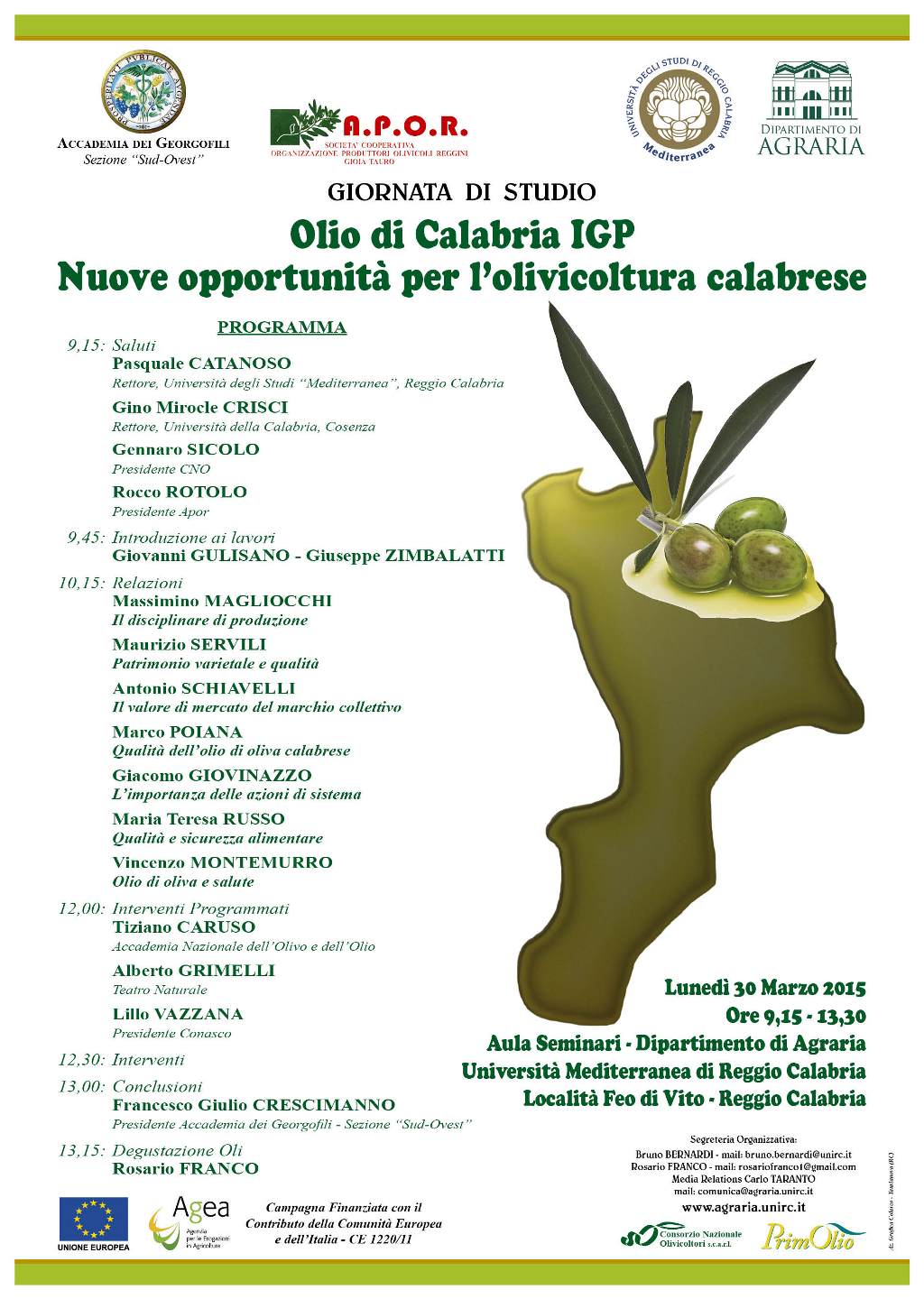 Lunedì 30 Marzo alle ore 09.15, presso l’Aula Seminari del Dipartimento di Agraria dell'Università Mediterranea di Reggio Calabria si terrà una giornata studio dal titolo “Olio di Calabria IGP. Nuove opportunità per l’olivicoltura calabrese”.