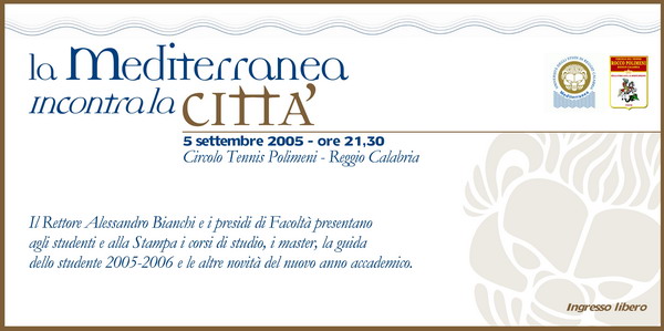 Il 5 settembre presso il Circolo Tennis Polimeni (Reggio Calabria) con inizio alle ore 21.20, il Rettore Alessandro Bianchi ed i Presidi di facoltà presentano l'offerta formativa, la guida dello studente, i master e le altre novità del nuovo anno accademico. L'Ingresso è libero.