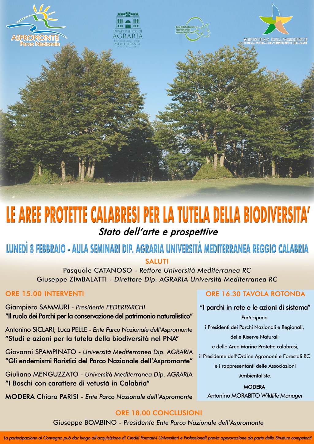 "Le Aree Protette per la tutela della biodiversità". Sato dell'Arte e Prospettive, è il tema del convegno promosso dall'Ente Parco Nazionale dell'Aspromonte in collaborazione con il Dipartimento Agraria dell'Università Mediterranea DI Reggio Calabria e l'Ordine dei Dottori Agronomi e dei Dottori Forestali della Provincia di Reggio Calabria che si svolgerà lunedì 8 febbraio dalle ore 15 presso l'Aula Seminari del dipartimento AGRARIA.