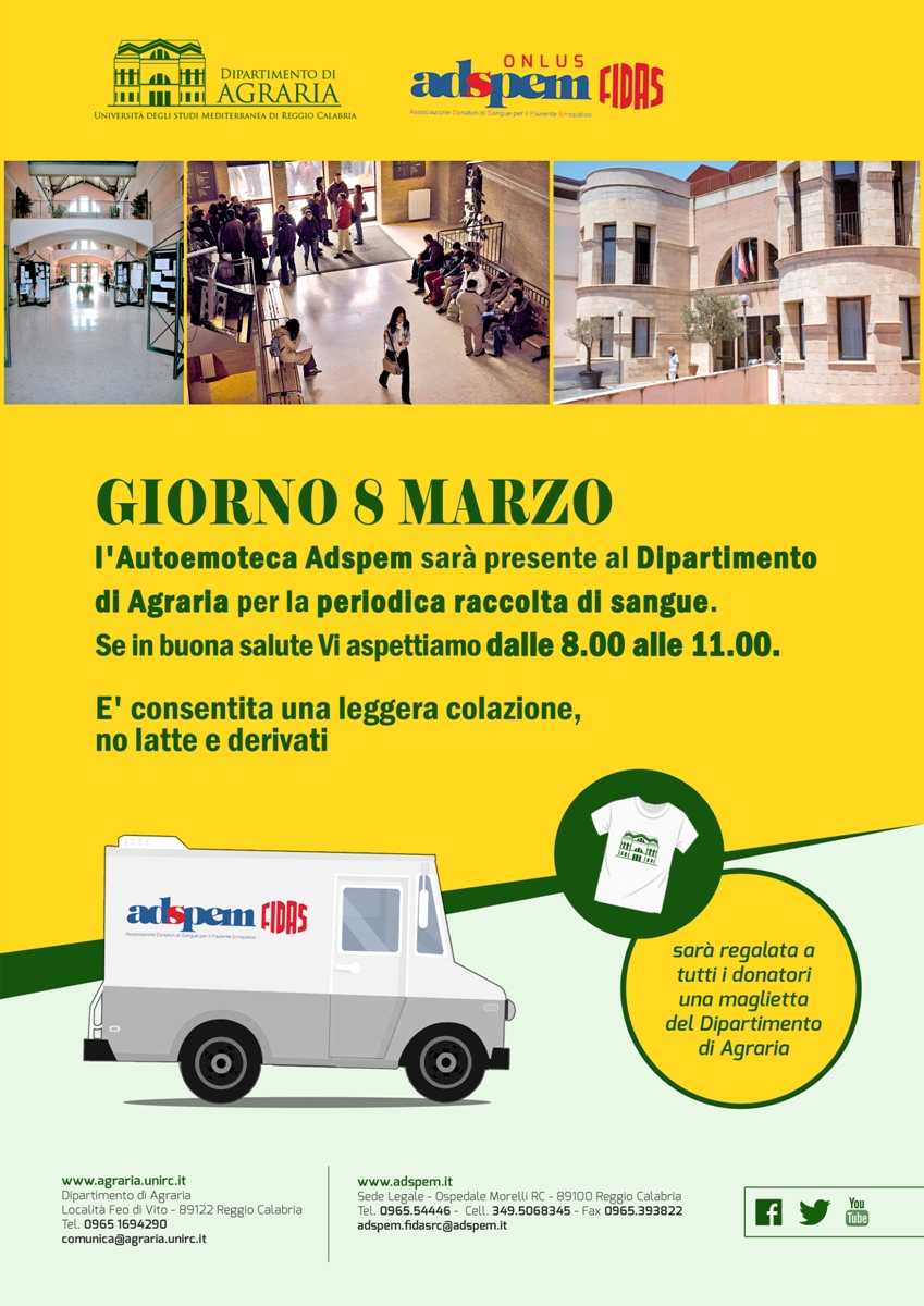 Martedì 8 marzo 2016 dalle ore 8.00 alle 11.00 l’autoemoteca dell'Adspem Fidas onlus sarà presente al Dipartimento di Agraria per la raccolta di sangue. (E’ consentita una leggera colazione no latte e derivati).