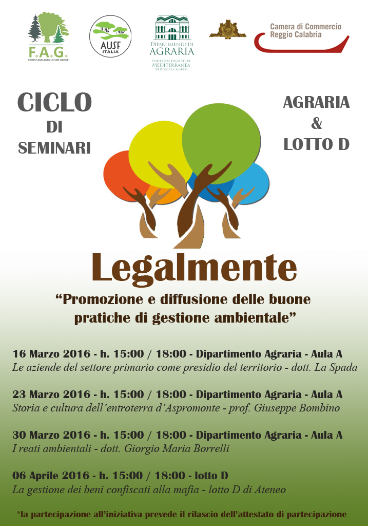Giorno 23 marzo nell'aula A del dipartimento di Agraria, dalle ore 15:00 alle ore 18:00 dove si terrà un seminario dal nome "Storia e cultura dell'entroterra d'Aspromonte" tenuto dal professore Giuseppe Bombino presidente dell'ente parco nazionale d'Aspromonte , questo seminario è il secondo del progetto "Legalmente" il terzo dal nome "Reati ambientali " si terrà il 30 marzo con la presenza del Primo Dirigente Giorgio Maria Borrelli del corpo forestale dello Stato e responsabile del Nucleo investigativo di Polizia Ambientale. I seminari sono stati realizzati grazie al supporto della camera di commercio e ideati dall'associazione F.A.G. , grazie anche alla sinergia con il Dipartimento di Agraria. La tematica centrale dell'ambiente nell'aspetto specifico dei beni confiscati, risulta oggi più che mai attuale.
