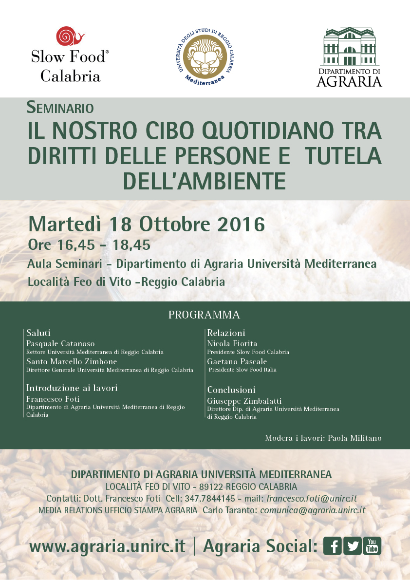 In questo contesto il Dipartimento di Agraria, da anni impegnato in attività didattiche e di ricerca in questo settore, ha ritenuto importante proporre questo incontro con Slow Food, allo scopo di favorire una plurale conoscenza di valori di grande rilevanza per l'umanità, meritevoli di continui approfondimenti e di un dibattito aperto.