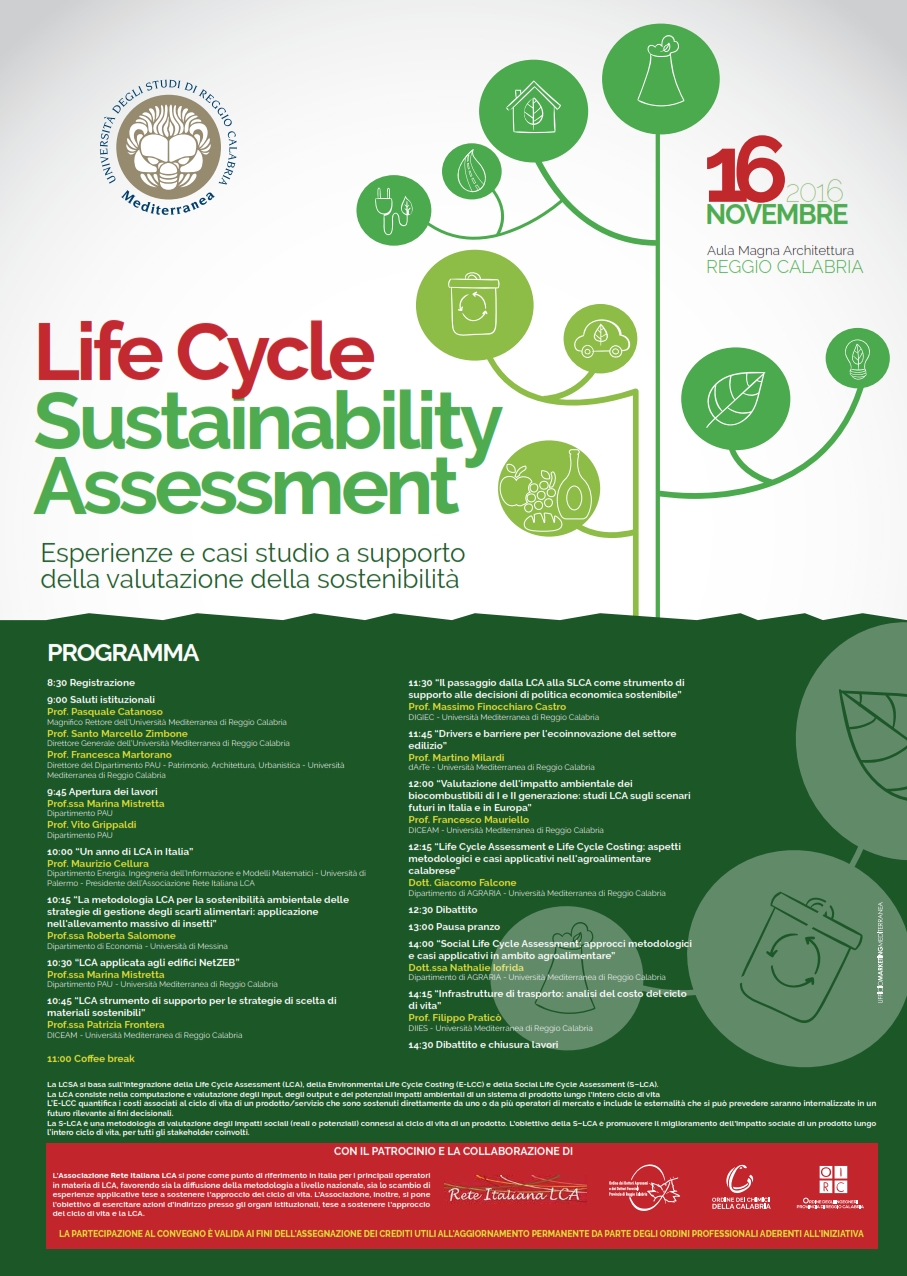 Mercoledì 16 novembre 2016 alle ore 9.00, presso l’Aula Magna di Architettura dell’Università Mediterranea di Reggio Calabria, si terrà il convegno “Life Cycle Sustainability Assessment (LCSA): Esperienze e casi studio a supporto della valutazione della sostenibilità” con la partecipazione di esperti nazionali.