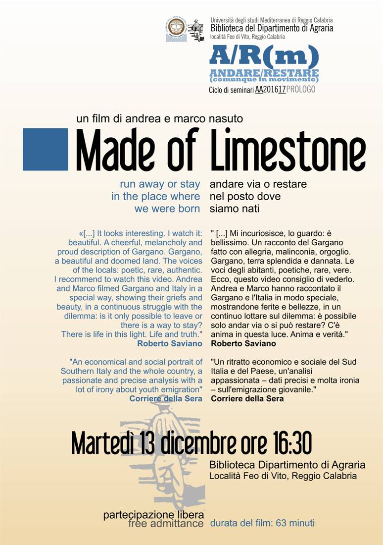 Martedì 13 dicembre alle 16.30, presso la Biblioteca del Dipartimento di Agraria dell’Università Mediterranea di Reggio Calabria, verrà proiettato il film “Made of limestone: run away or stay in the place where we were born” di Andrea e Marco Nasuto. Son fatti anche loro di pietra calcarea, Andrea e Marco, andati via da Manfredonia per studiare e lavorare. Cervelli migranti, diremmo, ma con un profondo legame, mai interrotto, con la loro terra, il Gargano. Il film è stato un vero e proprio caso internazionale, girato nel 2003 con un budget iniziale di pochi euro e un’attrezzatura minimale. Andrea e Marco non avevano nemmeno 25 anni. Una volta messo in circolazione il film ha suscitato una contagiosa attenzione fino ad arrivare sulle pagine del Corriere della Sera, che ne ha scritto come di "Un ritratto economico e sociale del Sud Italia e del Paese, un'analisi appassionata – dati precisi e molta ironia – sull'emigrazione giovanile." Anche lo scrittore Roberto Saviano ha voluto segnalare entusiasticamente questa insolita opera-prima dei fratelli Nasuto: “Il film mi incuriosisce, lo guardo: è bellissimo (...) fatto con allegria, malinconia, orgoglio. Andrea e Marco hanno raccontato il Gargano e l'Italia in modo speciale, mostrandone ferite e bellezze, in un continuo lottare sul dilemma: è possibile solo andar via o si può restare? C'è anima in questa luce. Anima e verità".