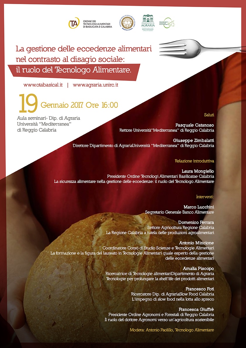 Si svolgerà giovedì 19 gennaio 2017 ore 16:00 presso l'Aula seminari del Dipartimento di Agraria dell'Università "Mediterranea" di Reggio Calabria il convegno dal titolo "La gestione delle eccedenze alimentari nel contrasto al disagio sociale: il ruolo del Tecnologo Alimentare". L'incontro è promosso dall'Ordine Professionale dei Tecnologi Alimentari Basilicata e Calabria ed è rivolto a studenti, professionisti, tecnologi alimentari e a tutta la cittadinanza che, sensibile, alla tematica dello spreco alimentare potrà approfondire e conoscere quali sono i rimedi per arginare questo preoccupante fenomeno. Nel mondo si spreca oltre un terzo del cibo prodotto di cui l'80% sarebbe ancora consumabile, mentre in Italia gli sprechi, specialmente tra le mura domestiche sia aggirano intorno al 42%. Una nuova sfida, dunque, per i Tecnologi Alimentari che sono impegnati nella lotta agli sprechi nelle Aziende agroalimentari ma anche una giusta informazione verso un consumo consapevole e responsabile. L'incontro, cui prenderanno parte il Magnifico Rettore dell'Università Mediterranea di Reggio Calabria Prof. Pasquale Catanoso e il Direttore del Dipartimento di Agraria di Reggio Calabria Prof. Giuseppe Zimbalatti, vedrà impegnati: Marco Lucchini segretario nazionale Banco Alimentare; Laura Mongiello Presidente dell'Ordine Professionale dei Tecnologi Alimentari BASICAL, Francesca Giuffrè Presidente dell'Ordine degli Agronomi e Forestali di Reggio Calabria; il mondo scientifico accademico con la partecipazione del Prof. Antonio Mincione e la Dott.ssa Amalia Piscopo; Slow Food Calabria con la partecipazione del Prof. Francesco Foti; il Dipartimento Agricoltura della Regione Calabria con la partecipazione dell' Avv. Domenico Ferrara. L'incontro sarà moderato dal Tecnologo Alimentare Antonio Paolillo.