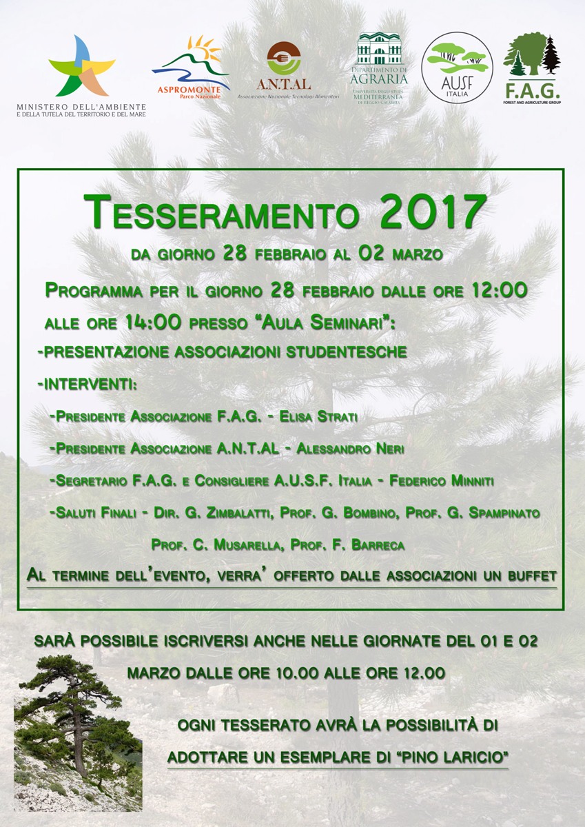 Giorno 28 febbraio in aula seminari dalle ore 12 alle ore 14 avverrà il tesseramento delle associazioni universitarie F.A.G. e A.N.TAL, dove interverranno i professori e i presidenti delle Associazioni che faranno una breve presentazione che riguarderà le attività svolte e quelle future. Chi si tessera avrà la possibilità di adottare un bellissimo esemplare di ‘Pino laricio’, al termine verrà offerto un buffet.