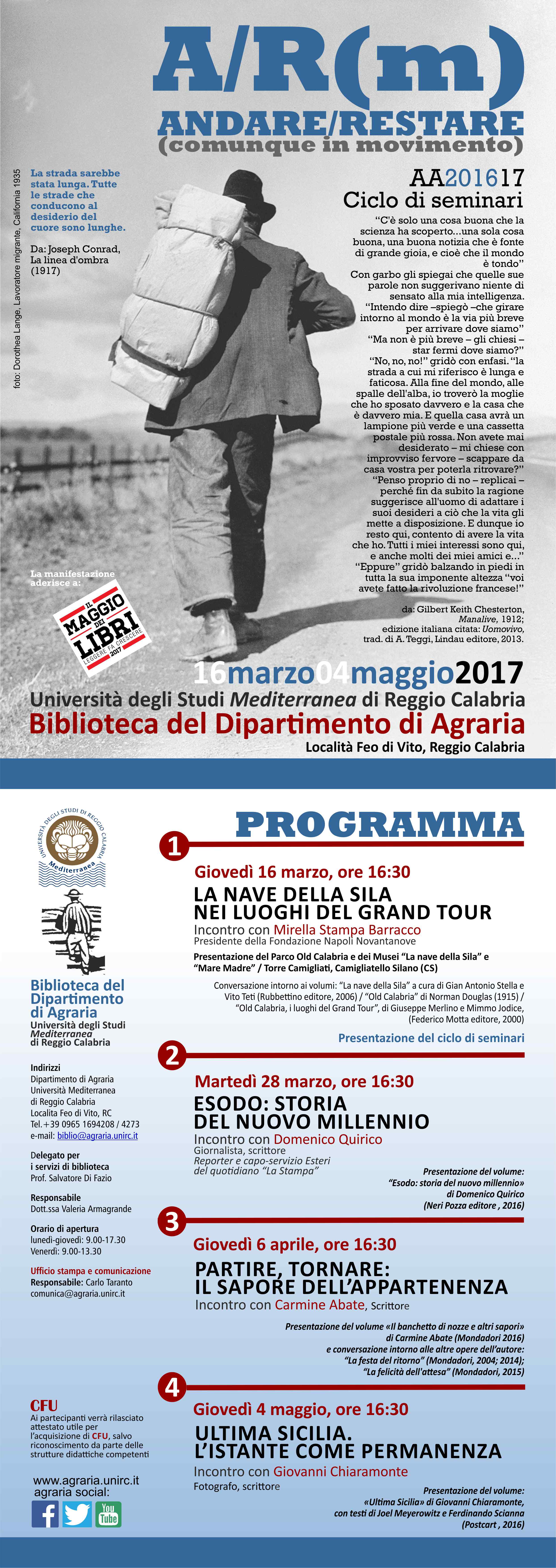 Prenderà avvio giovedì 16 marzo il consueto ciclo di seminari primaverili promosso dalla Biblioteca del Dipartimento di Agraria dell’Università Mediterranea di Reggio Calabria, in occasione della campagna nazionale “Il maggio dei libri: leggere fa crescere”. Il tema scelto è “Andare/Restare (comunque in movimento)” e i quattro incontri proposti vedranno alternarsi fino al 4 maggio gli illustri relatori invitati: Mirella Stampa Barracco, Domenico Quirico, Carmine Abate e Giovanni Chiaramonte.