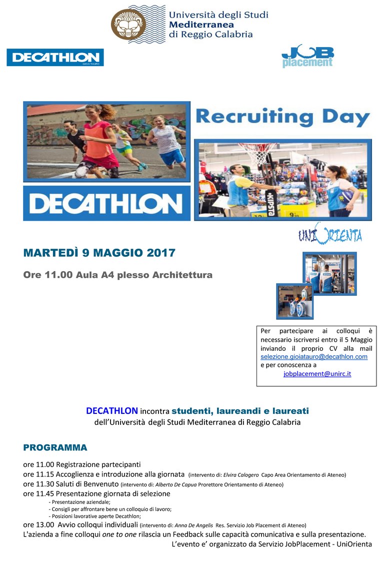 Per partecipare è necessario iscriversi entro il 5 Maggio, inviando il CV a selezione.gioiatauro@decathlon.com e per conoscenza a jobplacement@unirc.it.