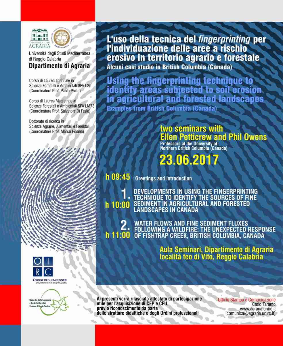 • ore 10.00: “Developments in using the fingerprinting technique to identify the sources of fine sediment in agricultural and forested landscapes in Canada”