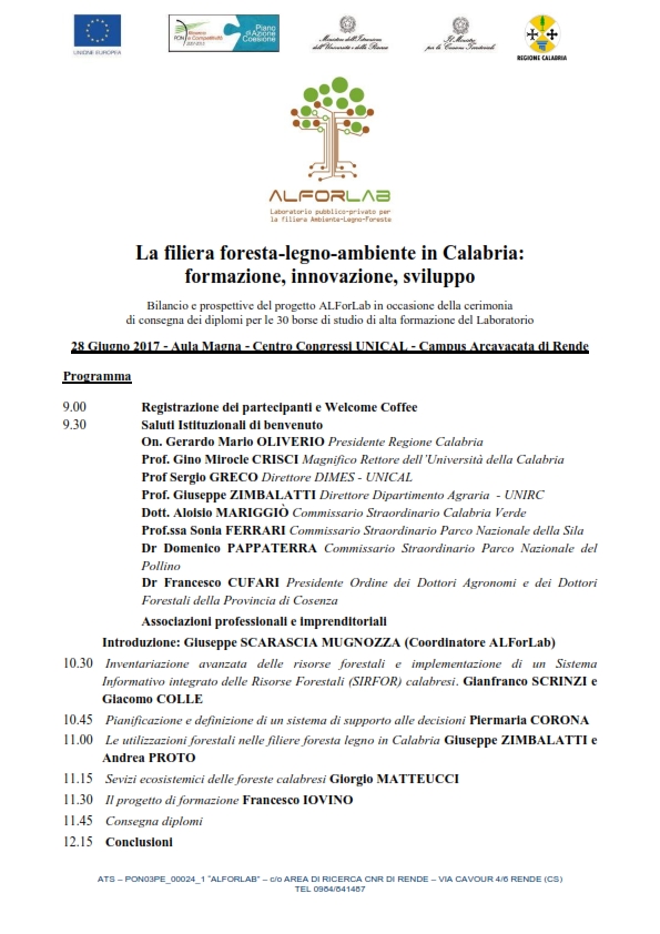 Nell'ambito del progetto di ricerca PON03PE_00024_1 “ALFORLAB", il prossimo 28 Giugno 2017 presso l'Aula Magna del Centro Congressi UNICAL - Campus Arcavacata di Rende - si terrà un importante seminario dal titolo "La Filiera Foresta - Legno - Ambiente in Calabria: formazione, innovazione, sviluppo" in occasione della cerimonia di consegna dei diplomi per le 30 borse di studio di alta formazione finanziate dal Laboratorio Pubblico-Privato “ALFORLAB". Infatti, tale Laboratorio è stato costituito, nell’ambito del Programma PON - Ricerca della Regione Calabria, dal CNR-Consiglio Nazionale delle Ricerche di Cosenza dall'Università della Calabria, dal Dipartimento di Agraria dell'Università Mediterranea di Reggio Calabria, dal CREA, e con imprese del settore legno, dell’informatica e del telerilevamento, per sostenere lo sviluppo e l’innovazione dell’industria forestale e del legno, un settore fondamentale e strategico per la Regione Calabria. Per il Dipartimento di Agraria interverranno il prof. Giuseppe Zimbalatti e il dott, Andrea R. Proto con l'intervento dal titolo: Le utilizzazioni forestali nelle filiere foresta-legno in Calabria. A conclusione del seminario saranno consegnati gli attestati finali ai corsisti che hanno partecipato al corso di Alta Formazione realizzato presso il Dipartimento di Agraria dal titolo “ESPERTO IN INNOVAZIONI TECNOLOGICHE FINALIZZATE ALLA RACCOLTA, TRASFORMAZIONE E IMPIEGO DEL LEGNO E ALLA VALUTAZIONE E CERTIFICAZIONE NELLA FILIERA FORESTA-LEGNO-AMBIENTE” -