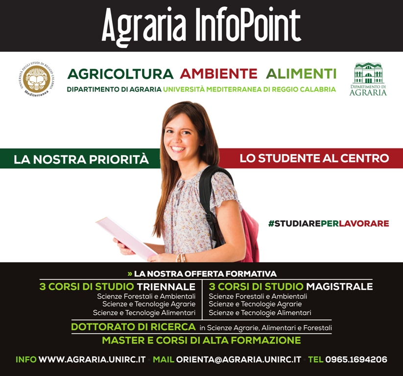 Agraria InfoPoint Immatricolazioni è lo spazio informativo del Dipartimento di Agraria dell’Università Mediterranea di Reggio di Calabria in cui vengono date informazioni sui corsi di Laurea, sul funzionamento delle strutture e dei servizi universitari.