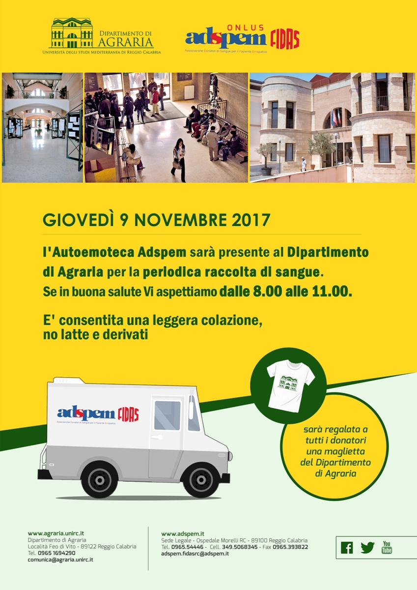 Giovedì 9 novembre dalle ore 8.00 alle 11.00 l’autoemoteca dell'Adspem Fidas onlus sarà presente al Dipartimento di Agraria per la raccolta di sangue. (E’ consentita una leggera colazione no latte e derivati).