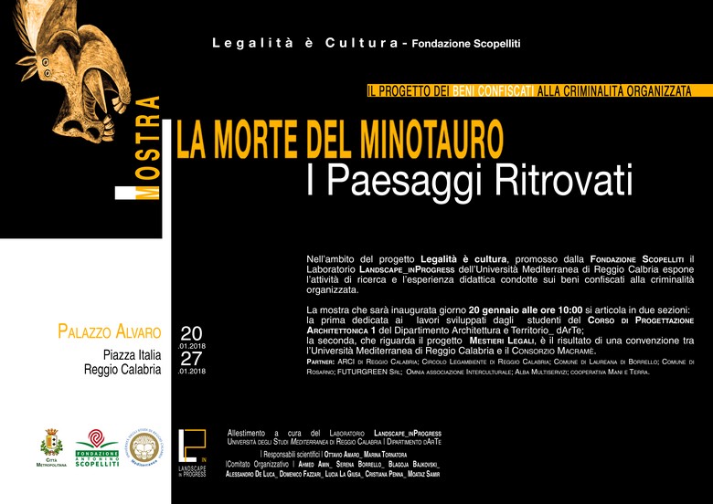 Il progetto La morte del minotauro del Laboratorio Landscape_inProgress sui manufatti e sui terreni confiscati, indica la necessità di un ripristino della legalità attraverso un’azione progettuale che ha la finalità di realizzare una nuova mappa di segni e presenze architettoniche concepite come la metamorfosi estetica, oltre che sociale, delle città.