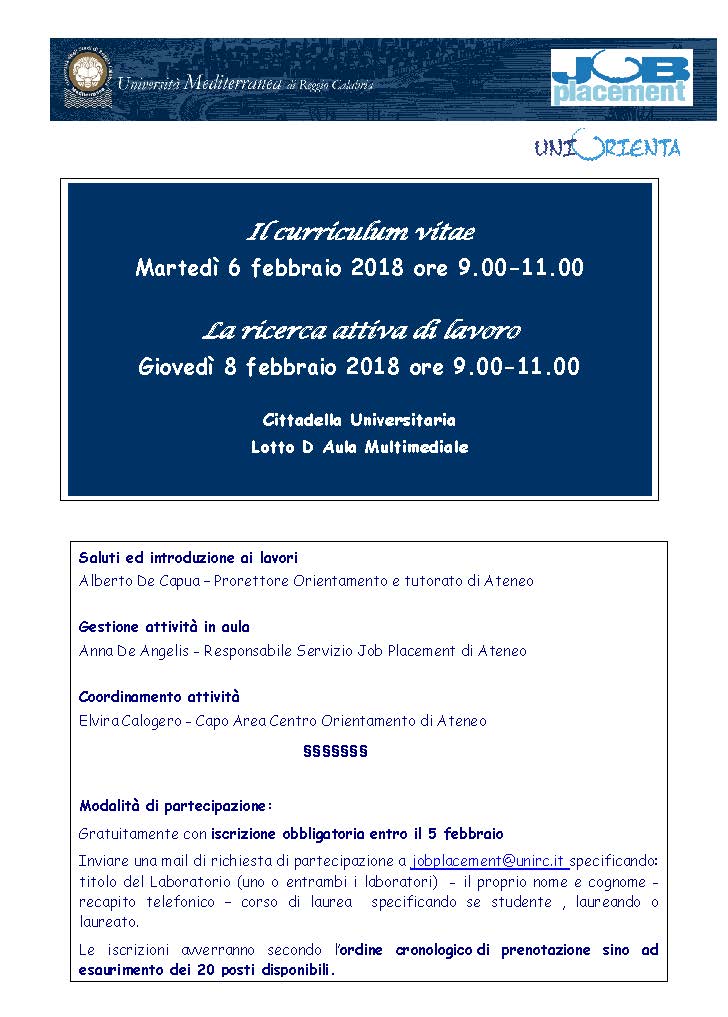 Inviare una mail di richiesta di partecipazione a jobplacement@unirc.it specificando: titolo del Laboratorio (uno o entrambi i laboratori) - il proprio nome e cognome - recapito telefonico – corso di laurea specificando se studente, laureando o laureato.