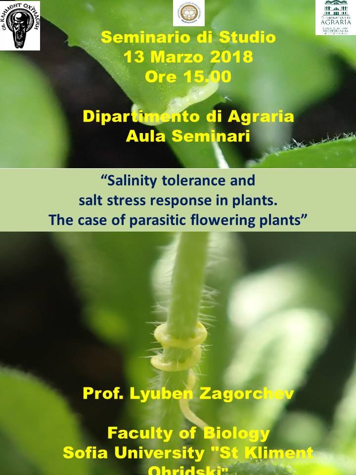 Martedì 13 Marzo alle ore 15.00 in Aula Seminari del Dipartimento di Agraria dell'Università Mediterranea di Reggio Calabria Località Feo di Vito il Prof. Lyuben Zagorchev, PhD del Dipartimento di Biologia, Università di Sofia "St Kliment Ohridski", Bulgaria, terrà un seminario dal titolo “Salinity tolerance and salt stress response in plants: the case of parasitic flowering plants"