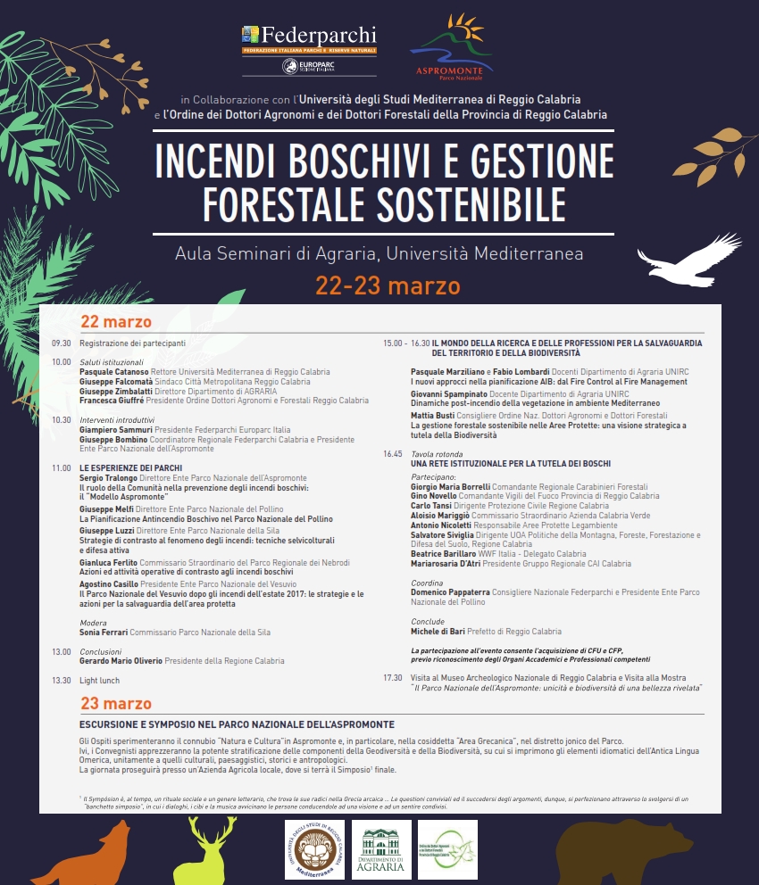 Il tema, su cui si confronteranno personalità istituzionali provenienti da tutta l’Italia, autorità accademiche e del mondo delle professioni, è estremante attuale: “Incendi boschivi e gestione forestale sostenibile”. Il Convegno è organizzato dal Parco dell’Aspromonte, in collaborazione con il Dipartimento di Agraria dell’Università degli Studi Mediterranea di Reggio Calabria e l’Ordine dei Dottori Agronomi e dei Dottori Forestali della provincia di Reggio Calabria, e si terrà presso l’Aula Seminari del Dipartimento di Agraria.