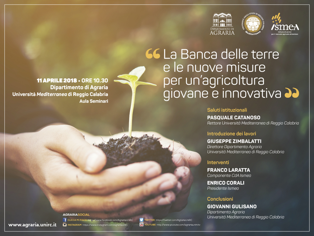 Di questo e degli altri strumenti di Ismea, nell'ambito di iniziative di orientamento universitario, si parlerà l'11 aprile alle 10,30 presso Aula Seminari del Dipartimento di Agraria dell'Università Mediterranea di Reggio Calabria, con il Presidente di Ismea Enrico Corali ed il componente del CdA Franco Laratta, con il prof. Giovanni Gulisano (Ordinario di Economia Agraria) ed il prof. Giuseppe Zimbalatti (Direttore del Dipartimento). I lavori saranno aperti dal Magnifico Rettore prof. Pasquale Catanoso, Ordinario di Scienza delle Finanze.