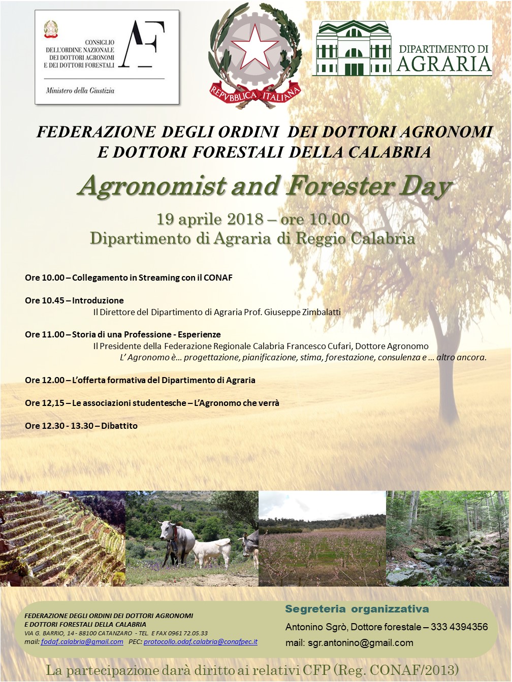 Giovedì 19 aprile presso l'Aula Seminari(Feo di Vito) del Dipartimento di Agraria dell'Università Mediterranea Reggio Calabria con inizio alle ore 10,00 si terrà “Agronomist and Forester Day".