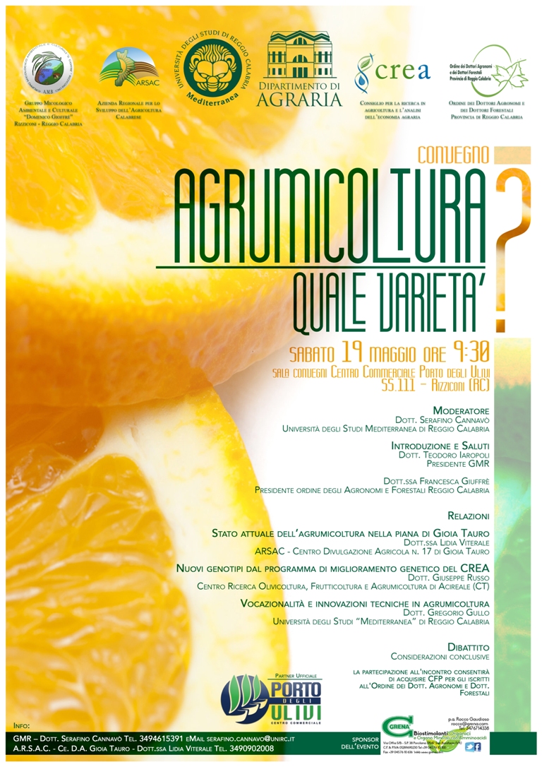 L’evento Patrocinato dal Dipartimento di Agraria dell’Università Mediterranea di Reggio Calabria, dall’Ordine dei Dottori Agronomi e dei Dottori Forestali della Provincia di Reggio Calabria e dal CREA – Consiglio per la Ricerca in Agricoltura e l’Analisi dell’Economia Agraria, vedrà quali relatori i Dott.ri Giuseppe Russo del Centro Ricerca Olivicoltura, Frutticoltura e Agrumicoltura di Acireale, Gregorio Gullo del Dipartimento di Agraria dell’Università Mediterranea di Reggio Calabria e Lidia Viterale dell’A.R.S.A.C. Ce.D.A. 17 DI Gioia Tauro.