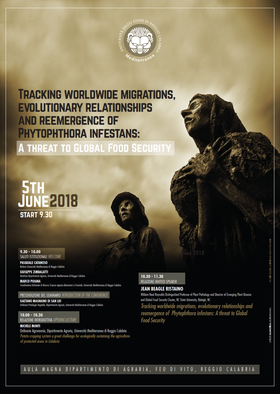 Martedì 5 giugno alle ore 9.30 presso l'Aula Seminari del Dipartimento di Agraria dell'Università Mediterranea di Reggio Calabria si terrà un convegno dal titolo "Tracking worldwide migrations, evolutionary relationships and reemergence of Phytophthora infestans: A threat to Global Food Security". La storica carestia che colpì l’Irlanda nel XIX secolo: la peronospora della patata è un pericolo tuttora incombente per la sicurezza alimentare a livello mondiale