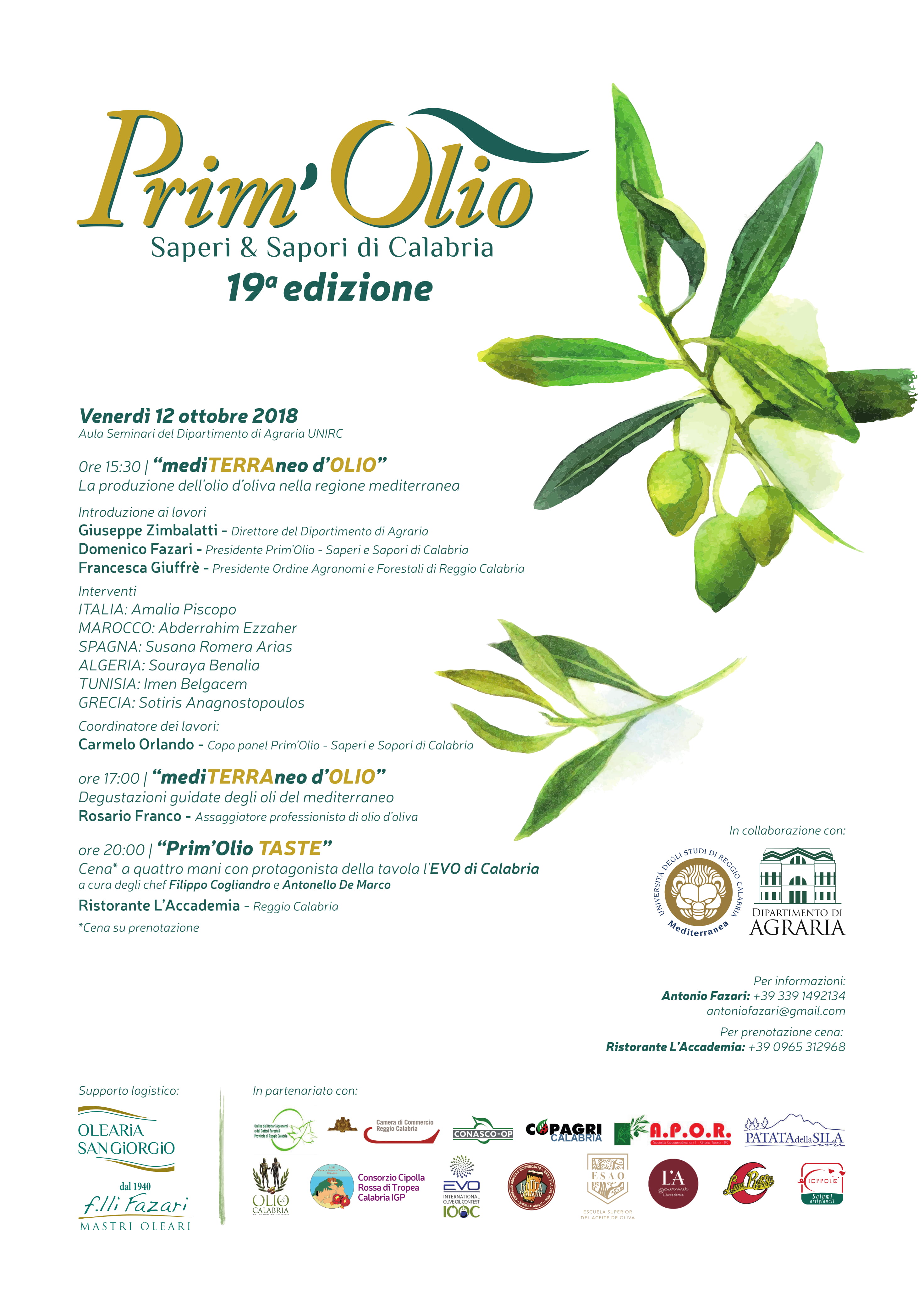 Al via con il convegno “MediTERRAneo d’OLIO” e le degustazioni guidate degli oli del mediterraneo, la 19a edizione della manifestazione Prim’Olio, organizzata dall’associazione Saperi & Sapori di Calabria Prim’Olio in collaborazione con il Dipartimento di Agraria dell’Università Mediterranea di Reggio Calabria. L’appuntamento è per venerdì 12 ottobre presso l’aula seminari del Dipartimento di Agraria.