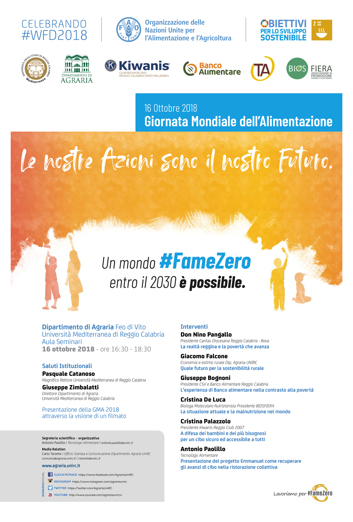 Dal 1981, la giornata mondiale dell'alimentazione ha adottato un tema diverso ogni anno, al fine di evidenziare le aree necessarie per l'azione e fornire un approccio comune. Il tema di quest’anno scelto dalla FAO e’ #FAMEZERO. Fame Zero significa collaborare affinché tutti abbiano accesso a cibo sufficiente e che sia sicuro, sano e nutriente. Per raggiungere questo obiettivo si deve adottare uno stile di vita più sostenibile, lavorare con gli altri, condividere le nostre conoscenze ed essere disposti a dare una mano per migliorare il mondo. Dopo un periodo di declino, la fame nel mondo è di nuovo in aumento, infatti, secondo il rapporto “Lo Stato della sicurezza alimentare e della nutrizione nel mondo 2018”, al giorno d'oggi oltre 820 milioni di persone soffrono di denutrizione cronica. Di tutto questo se ne parlerà martedì 16 0ttobre ore 16:30 presso Aula Seminari del Dipartimento di Agraria dell’Università “Mediterranea” di Reggio Calabria. Al Tavolo presenzieranno il Magnifico Rettore dell’Università “Mediterranea” di Reggio Calabria Pasquale Catanoso che porterà i suoi saluti istituzionali insieme a Giuseppe Zimbalatti Direttore del Dipartimento di Agraria, Sacerdote Nino Pangallo Presidente Caritas Diocesana Reggio Calabria – Bova, Giacomo Falcone del Dipartimento di Agraria, Giuseppe Bognoni Presidente Banco Alimentare Reggio Calabria, Cristina De Luca Biologa Molecolare Nutrizionista, Cristina Palazzolo Presidente Kiwanis Reggio Club 2007, Antonio Paolillo Tecnologo Alimentare.