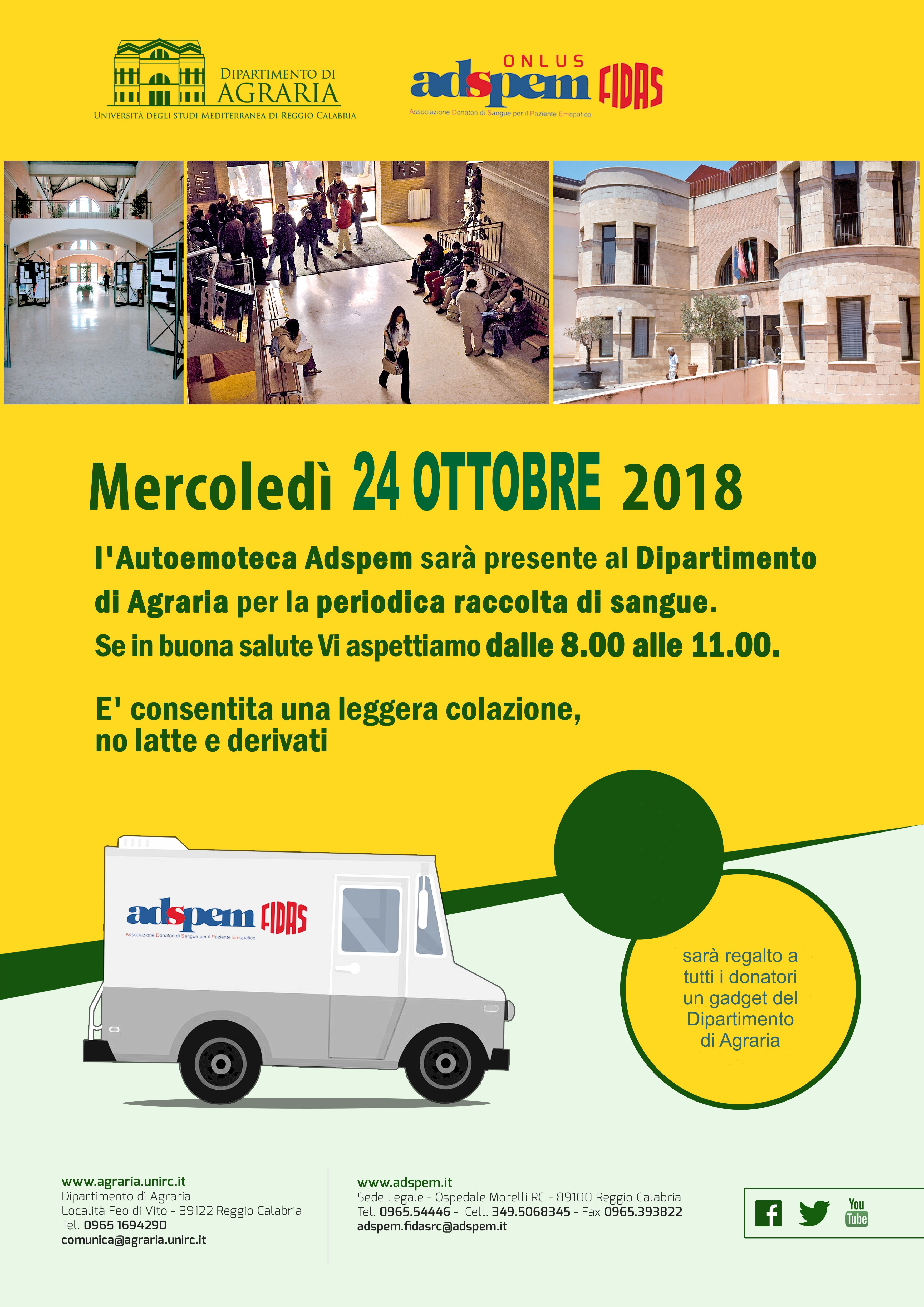 Due giorni di Adpsem ad Agraria martedì 23 alle ore 11.00 presso l'Aula Seminari vi sarà un seminario-incontro con la responsabile ADSPEM di Reggio Calabria la Dott.ssa Caterina Muscatello che presenterà la giornata di mercoledì 24 ottobre dalle ore 8.00 alle 11.00 per la raccolta di sangue.
