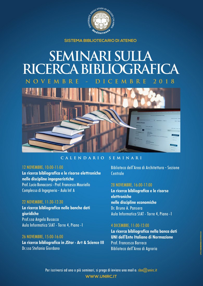 Il Sistema Bibliotecario di Ateneo ha organizzato un nuovo ciclo di seminari sulla ricerca bibliografica, che si svolgerà nei mesi di novembre e dicembre prossimi.