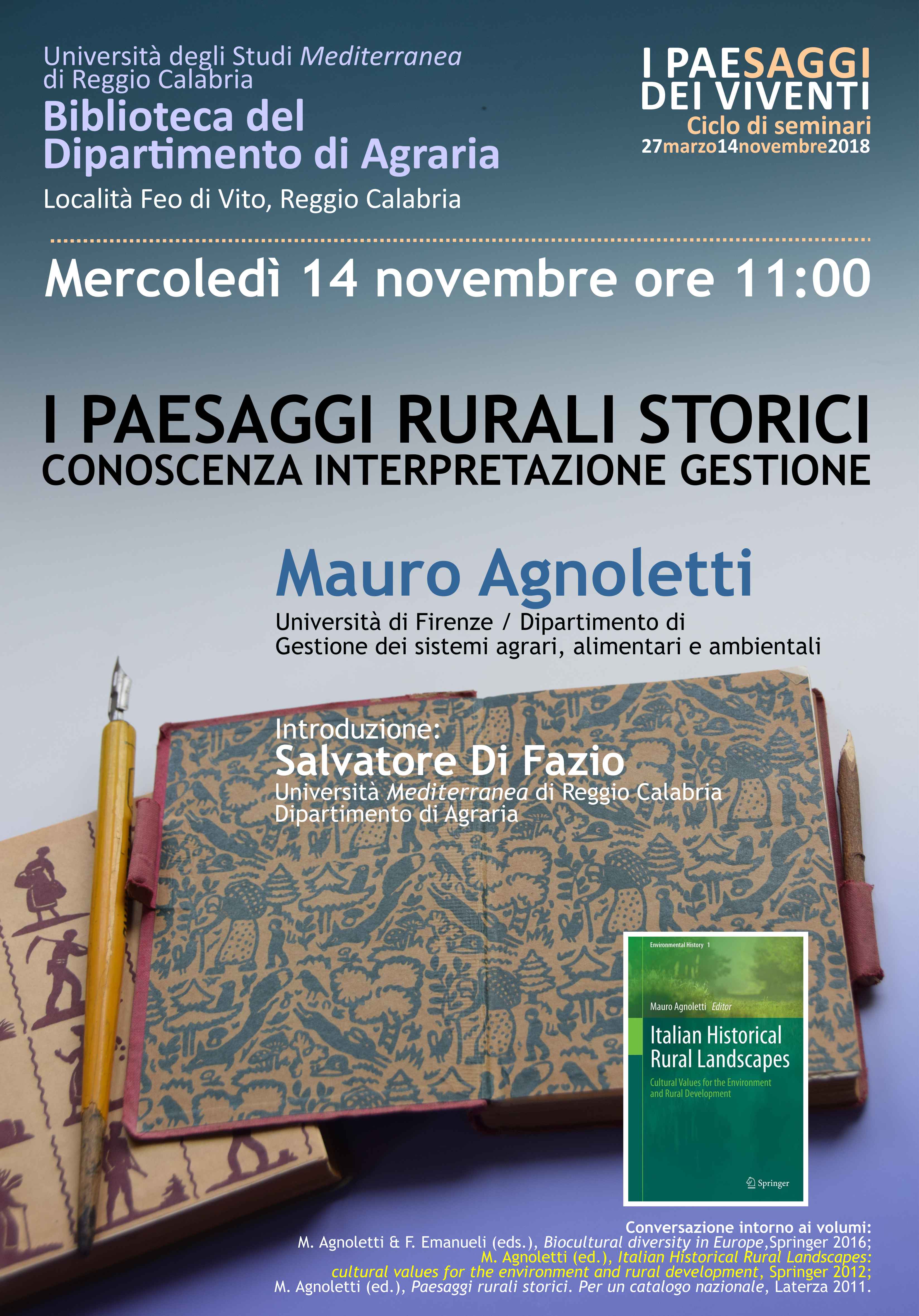 Mercoledì 14 novembre il Prof. Mauro Agnoletti (Università di Firenze) chiuderà il ciclo di seminari “I Paesaggi dei viventi” promosso dalla Biblioteca del Dipartimento di Agraria dell’Università Mediterranea di Reggio Calabria (Località Feo di Vito, Reggio Calabria). Titolo dell’intervento è “I paesaggi rurali storici: conoscenza, interpretazione, gestione”. Il seminario verrà introdotto dal Prof. Salvatore Di Fazio, delegato ai Servizi di Biblioteca e docente di “Pianificazione e infrastrutture per il territorio agroforestale”.