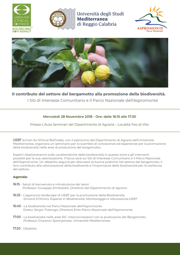 Il seminario è organizzato da UEBT (Union for Ethical BioTrade), con il patrocinio del Dipartimento di Agraria dell’Università Mediterranea, ed è finalizzato allo scambio di conoscenze ed esperienze per la promozione della biodiversità nelle aree di produzione del bergamotto.
