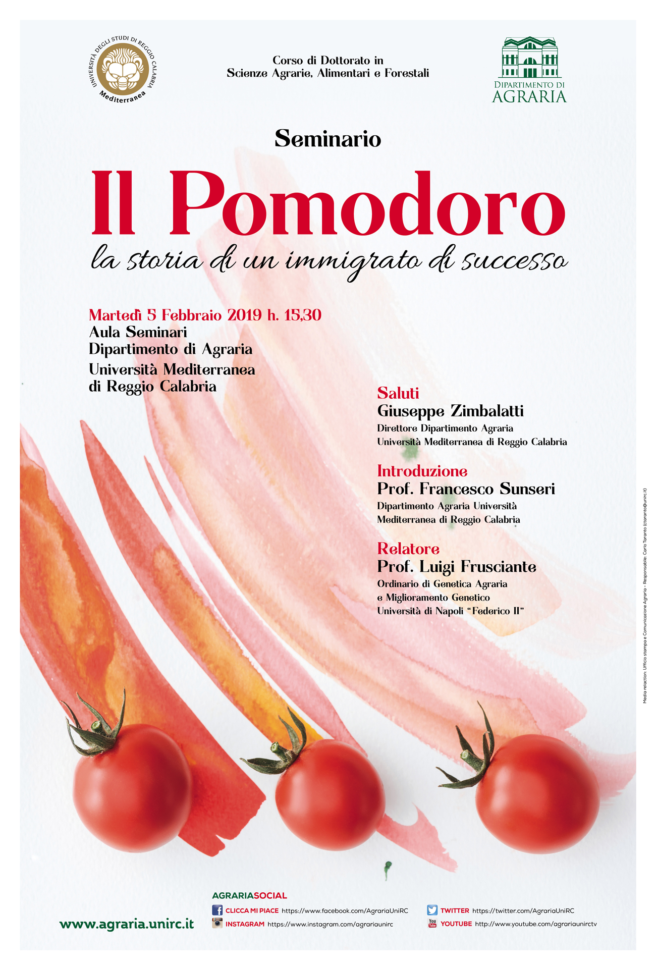Nell’ambito del Dottorato di Ricerca in Scienze Agrarie, Alimentari e Forestali del Dipartimento di AGRARIA, martedì 5 febbraio alle ore 15,30 presso l'Aula Seminari il Prof. Francesco Sunseri ha organizzato un seminario dal titolo “Il pomodoro, la storia di un immigrato di successo” relatore Prof. Luigi Frusciante - Ordinario di Genetica Agraria e Miglioramento Genetico presso l'Università di Napoli “Federico II”.