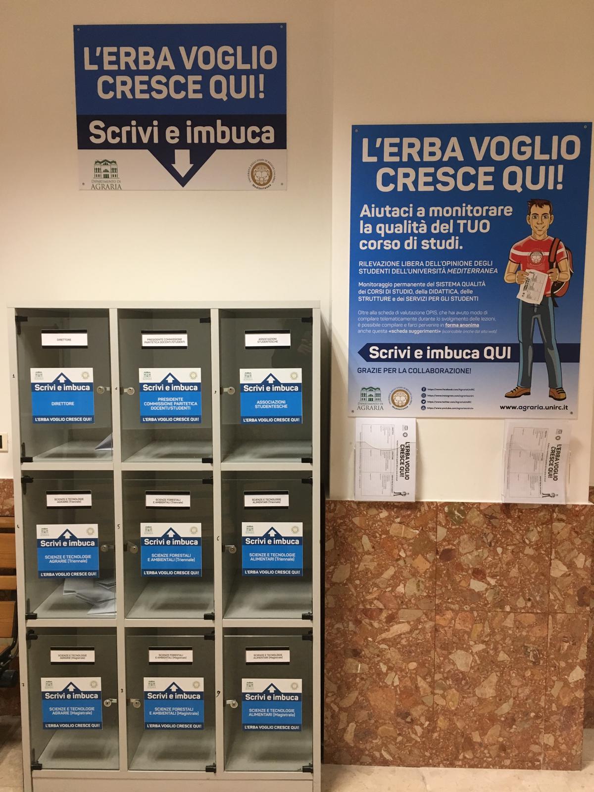 Nel principale intento di porre al centro delle attenzioni del Dipartimento di Agraria le VOSTRE OPINIONI e le VOSTRE ESIGENZE, abbiamo attivato un box esclusivamente dedicato alla permanente raccolta dei VOSTRI SUGGERIMENTI. Non a caso, abbiamo pensato e riteniamo realmente che possa essere il luogo ideale e più fertile per far crescere la "VOSTRA ERBA VOGLIO". Ci auguriamo che questa iniziativa incontri il VOSTRO consenso e aiuti concretamente i Corsi di Studio e il Dipartimento a sviluppare e realizzare il miglior percorso di crescita da VOI AUSPICATO. Approfittatene responsabilmente.
