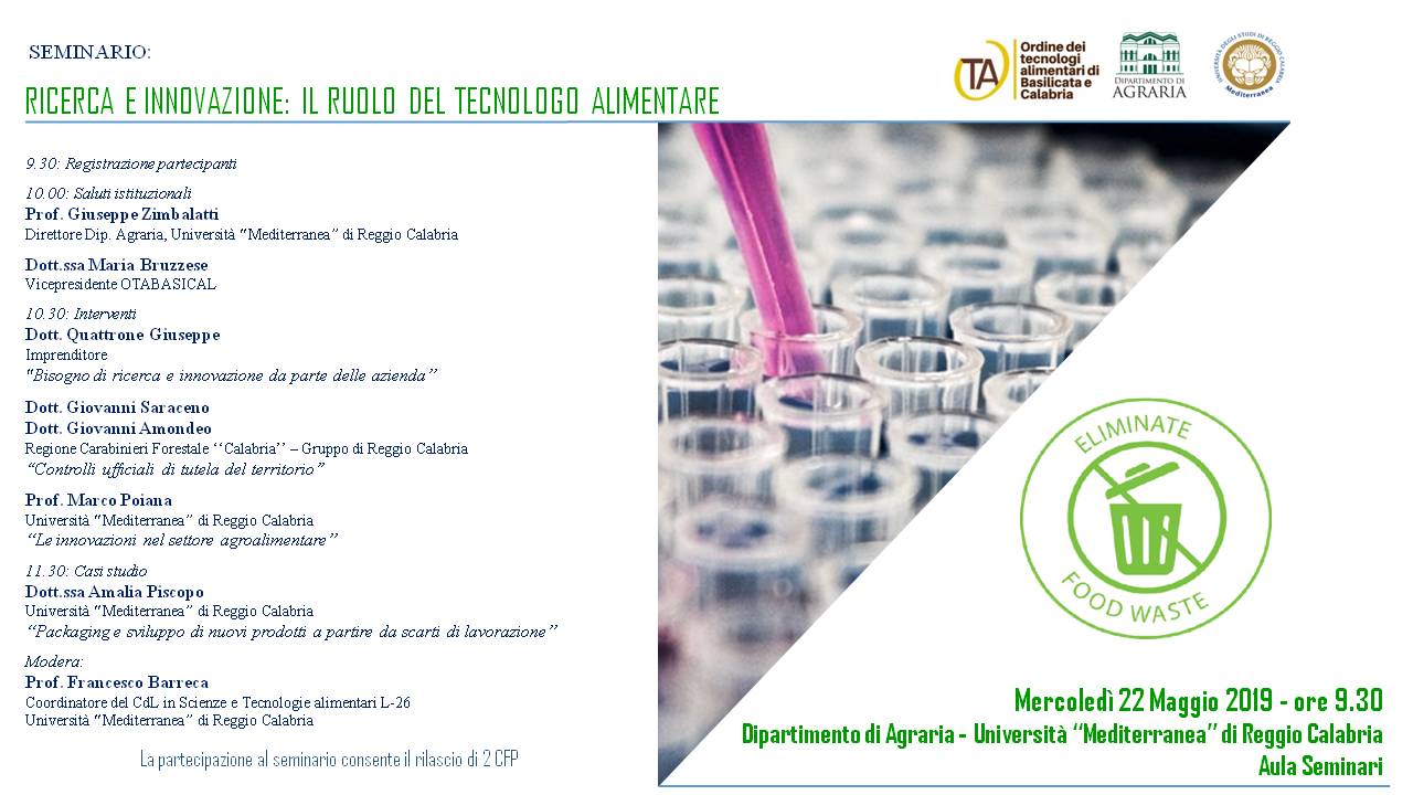 Mercoledi 22 maggio alle ore 9.30 presso l'Aula Seminari del Dipartimento di Agraria della Mediterranea si terra un seminario dal titolo Ricerca e Innovazione. Il ruolo del Tecnologo Alimentare.