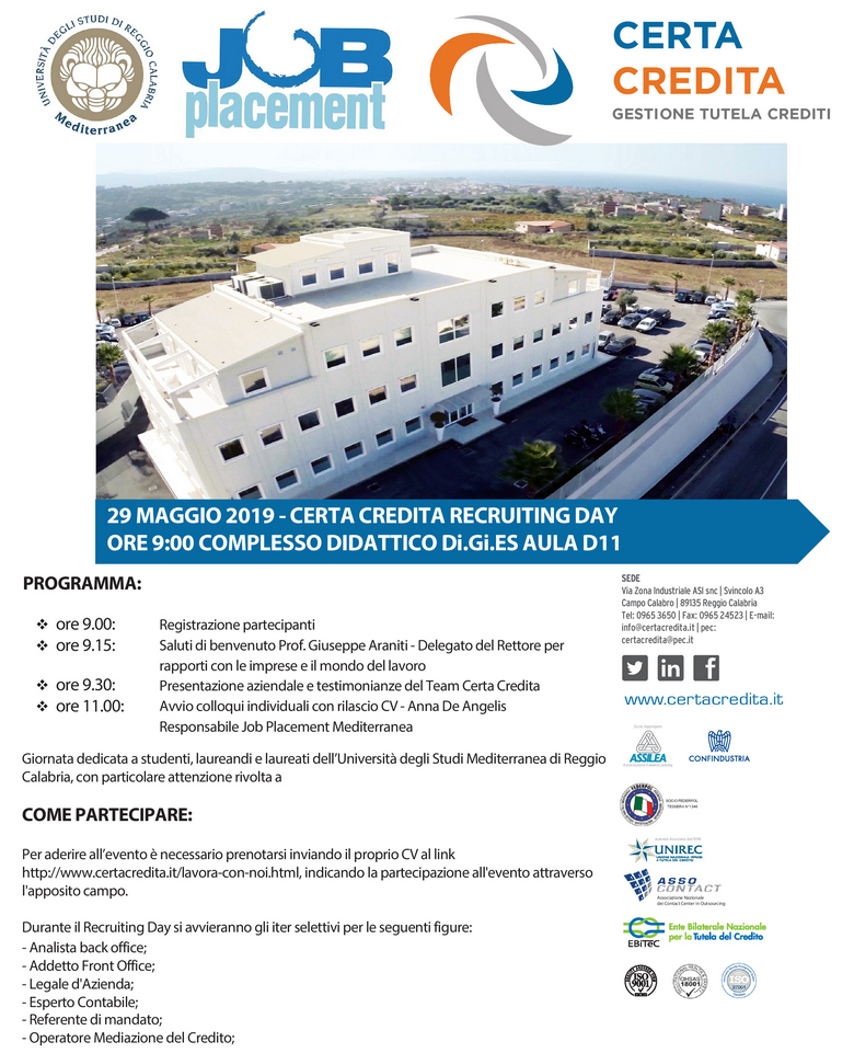 Mercoledì 29 maggio alle ore 9.00 in Aula D11 - Complesso didattico Di.Gi.ES - il Job Placement dell’Università Mediterranea di Reggio Calabria Invita studenti laureandi e laureati della Mediterranea Al RECRUITING DAY CERTA CREDITA