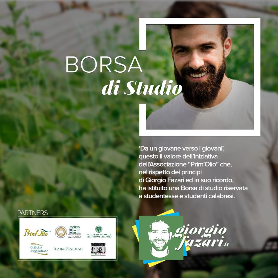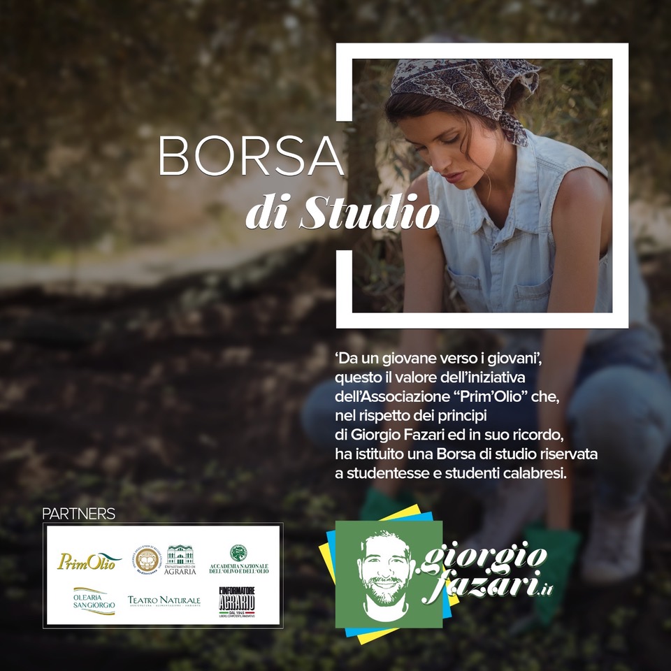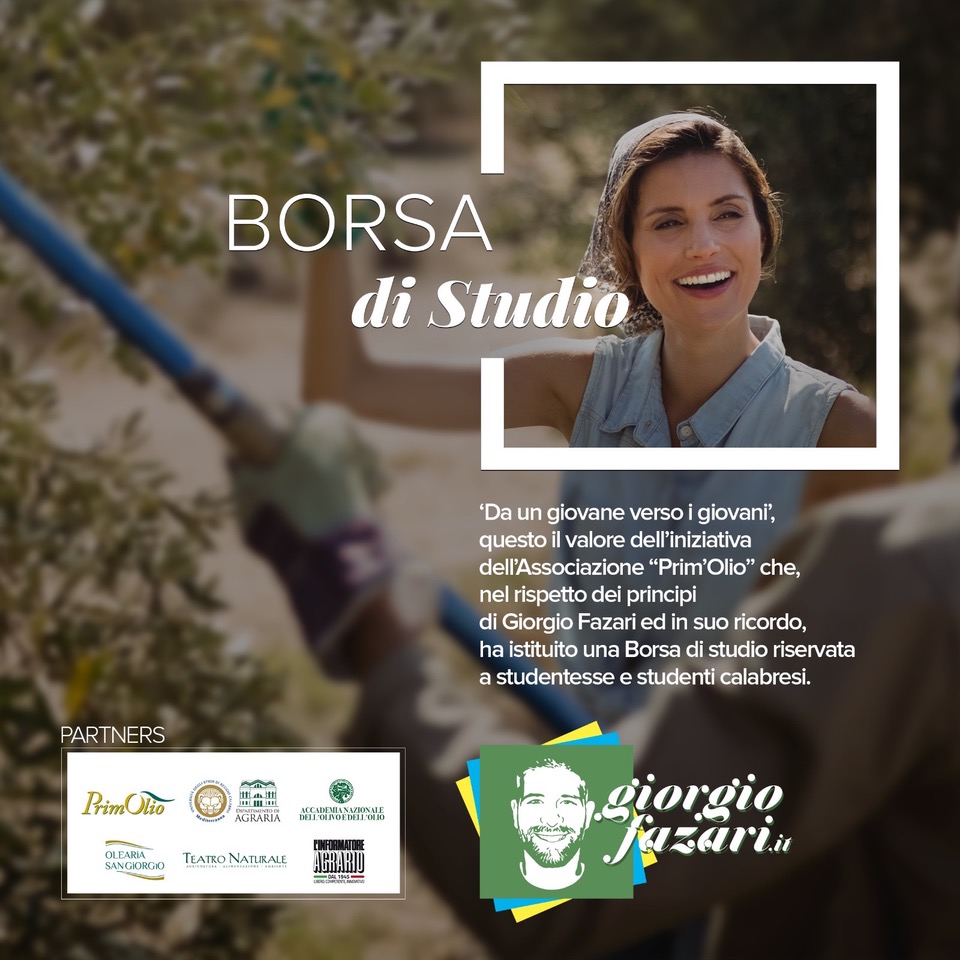 La borsa di studio, di € 2.000,00, sarà sostenuta dall’Azienda Olearia San Giorgio, impresa di famiglia del compianto Giorgio Fazari; di rilievo i partner a sostegno del progetto: Dipartimento di Agraria dell’Università degli Studi “Mediterranea” di Reggio Calabria, Accademia Nazionale dell’Olivo e dell’Olio, Teatro Naturale, Informatore Agrario.