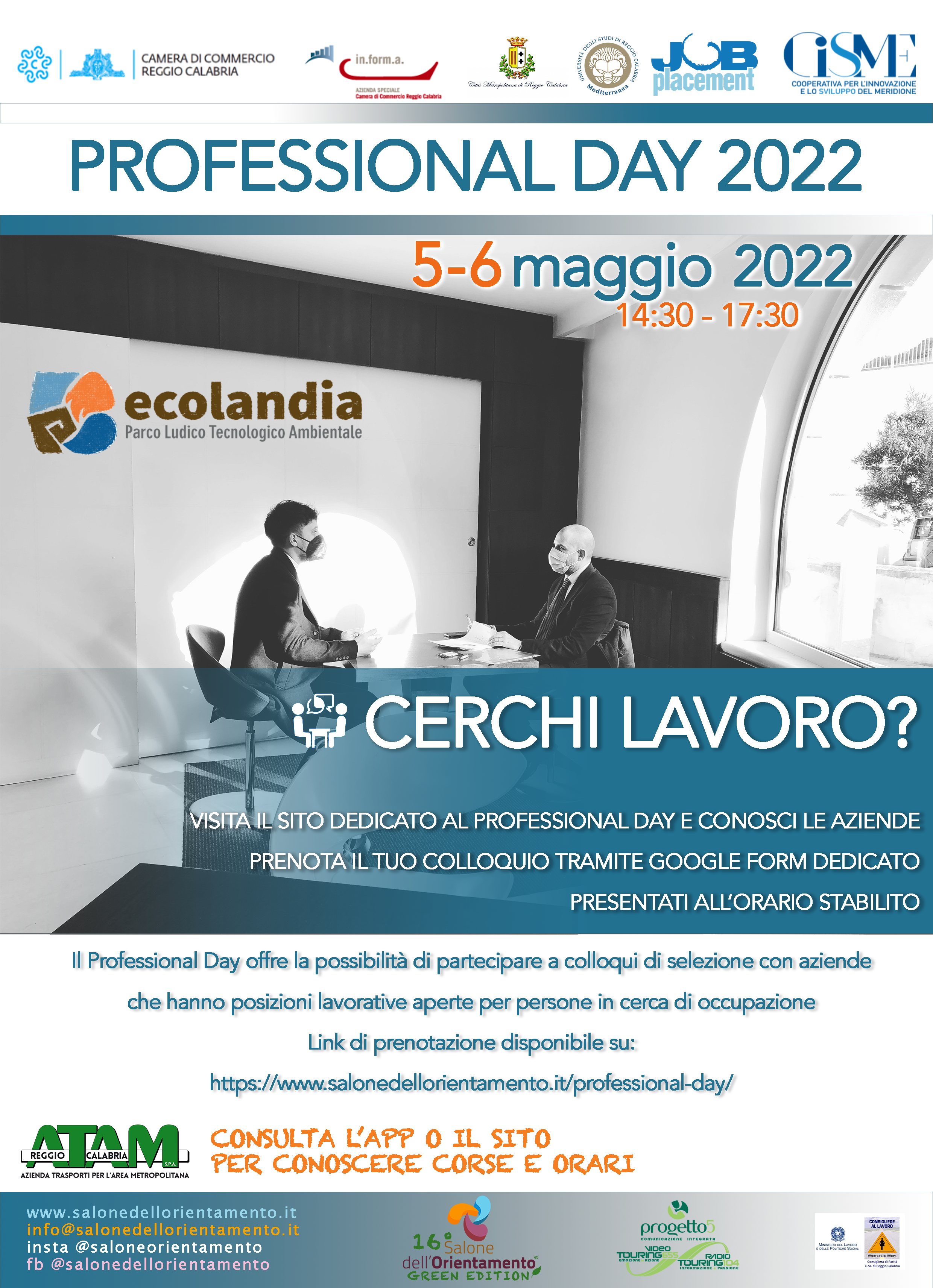 Il Job Placement dell’Università Mediterranea invita chi è in cerca di occupazione al PROFESSIONAL DAY 2022 nei pomeriggi del 5 e 6 maggio al Parco Ecolandia Reggio Calabria .