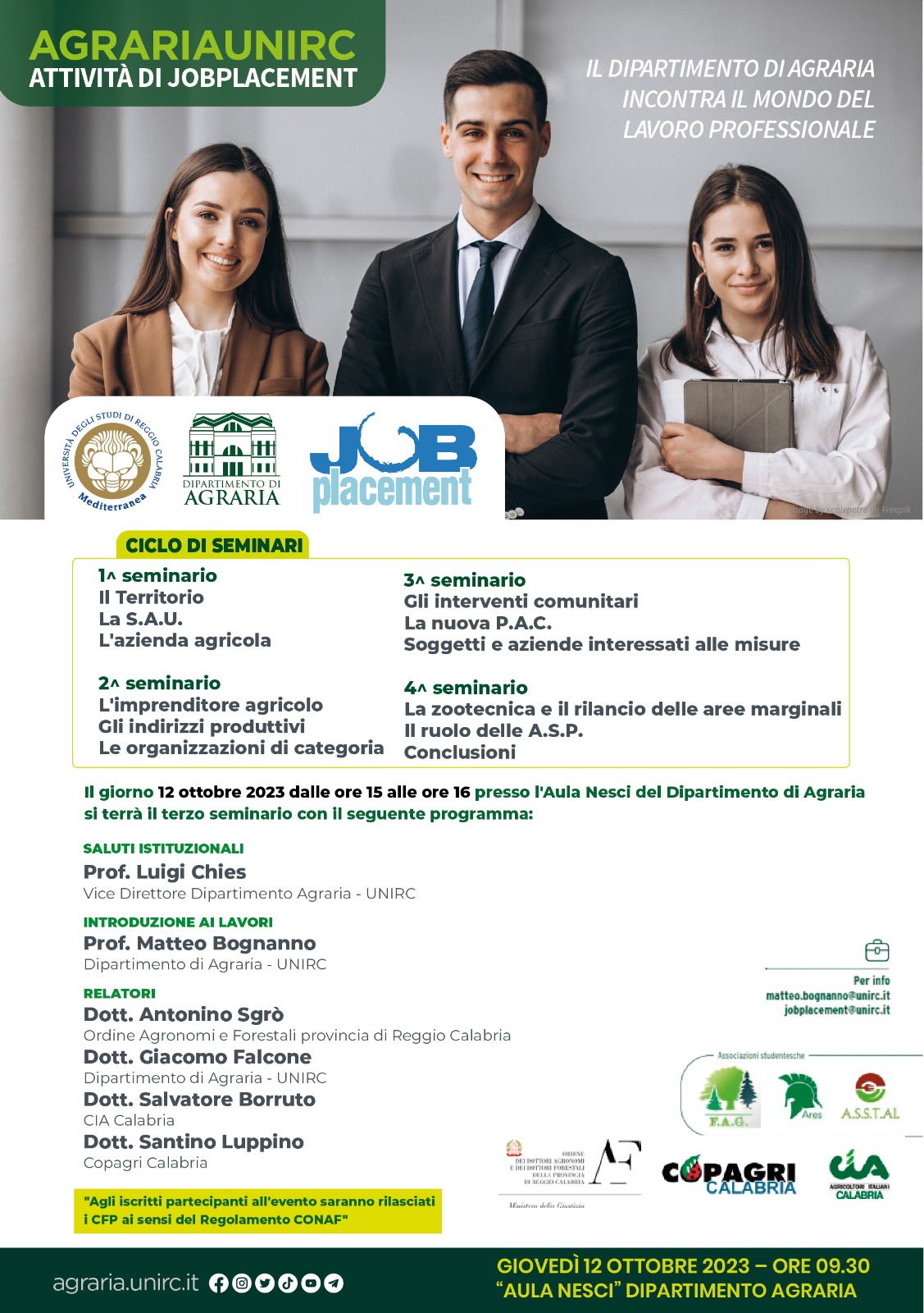 Il Job Placement di Ateneo e il Dipartimento di Agraria hanno organizzato un ciclo di seminari per promuovere l'incontro con il mondo delle professioni.