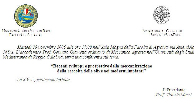Si comuinica che martedì 28 novembre alle ore 17.00 presso la Facoltà di Agraria di BARI il Prof. G. Giametta terrà un seminario , organizzato dalla sezione sud-est dell'accademia dei Georgofili In allegato il programma del seminario