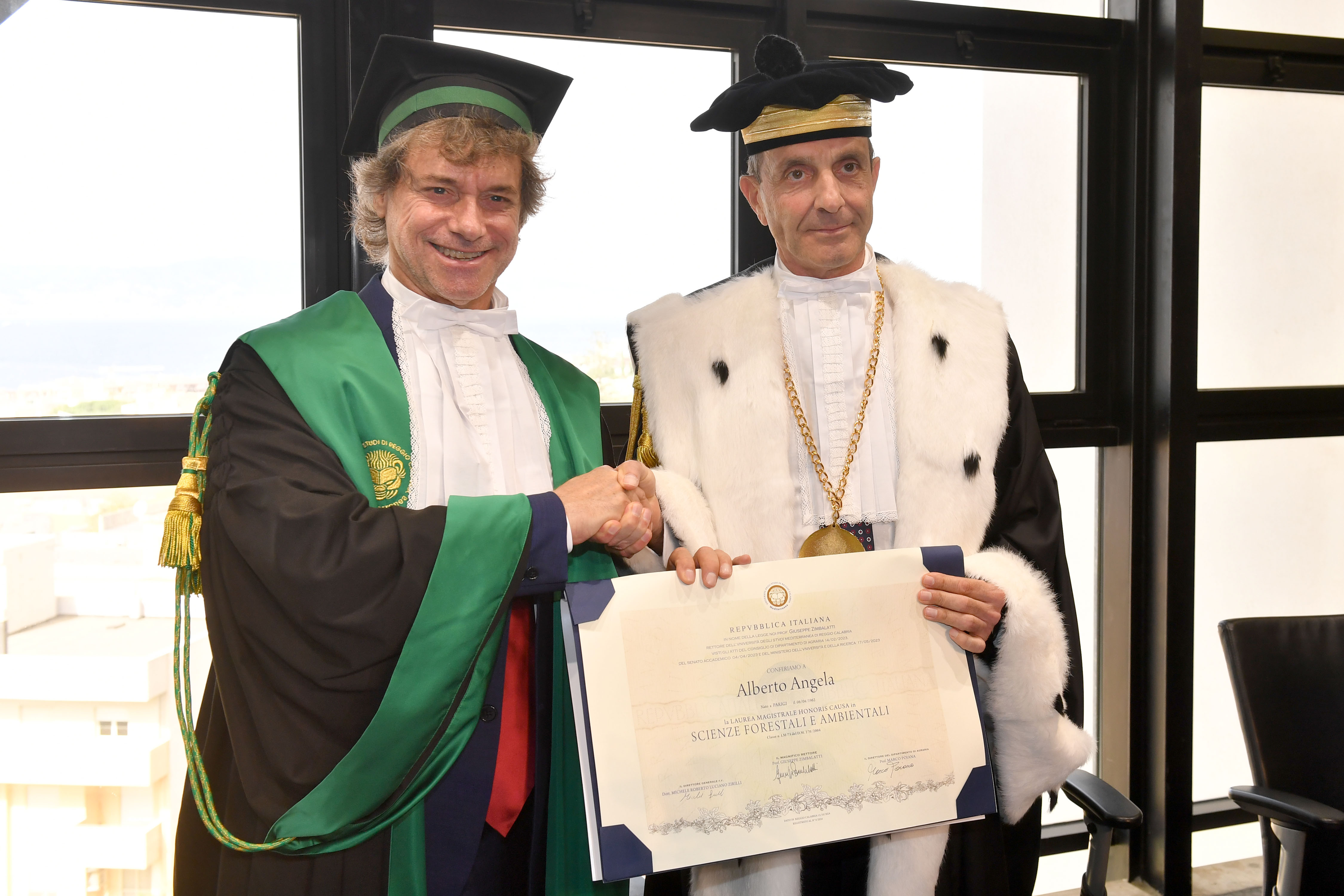 Le motivazioni del conseguimento sono state illustrate dal neo Direttore del Dipartimento di Agraria Marco Poiana, “il Dott. Alberto Angela ha “elaborato” un uso sapiente del mezzo televisivo, facendolo divenire strumento di elevazione Culturale della Popolazione e di promozione della Conoscenza. Con particolare riferimento alla trattazione dei temi inerenti alle risorse naturali e agli equilibri ambientali, il modello di comunicazione attuato elegge lo spettatore ad interlocutore privilegiato del metodo scientifico, consegnandogli, in una dimensione filosofica inedita e creativa, la possibilità di partecipare alla conoscenza e alla scoperta. I Documentari da lui proposti evidenziano una matura conoscenza delle discipline biologiche e naturalistiche applicate ai sistemi naturali; con una divulgazione scientifica orientata alla conservazione e valorizzazione degli habitat naturali e delle foreste, sempre supportata da una significativa ed intensa attività di aggiornamento e di valorizzazione dei risultati e dei prodotti della ricerca scientifica”.