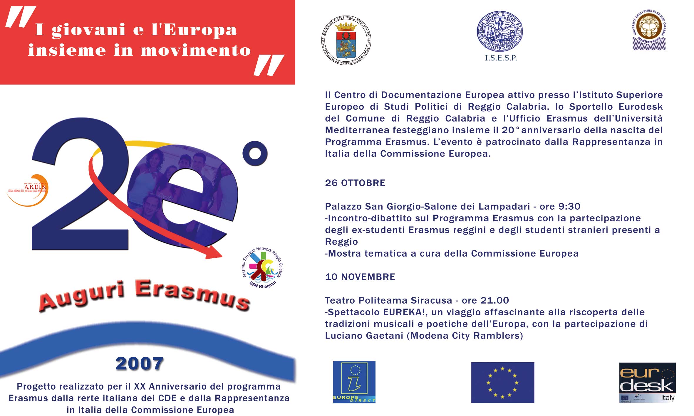 Auguri Erasmus è l'iniziativa promossa dall’Università Mediterranea (Ufficio Erasmus), il Centro di Documentazione Europea (ISESP) e lo Sportello Eurodesk (Comune di Reggio Calabria) per festeggiare insieme il 20° anniversario della nascita del Programma Erasmus, il più noto dei programmi di mobilità studentesca in ambito europeo. Programma Venerdì 26 Ottobre 2007 Palazzo San Giorgio - Salone dei Lampadari - Ore 09.30 Incontro-dibattito sul Programma "Erasmus" con la partecipazione degli ex-studenti Erasmus reggini e degli studenti stranieri presenti a Reggio Mostra tematica a cura della Commissione Europea Sabato 10 Novembre 2007 - Teatro Politeama Siracusa - ore 21.00 Spettacolo "EUREKA!" Un viaggio affascinante alla riscoperta delle tradizioni musicali e poetiche dell'Europa, con la partecipazione di Luciano Gaetani (Modena City Ramblers). Invito-programma in allegato.