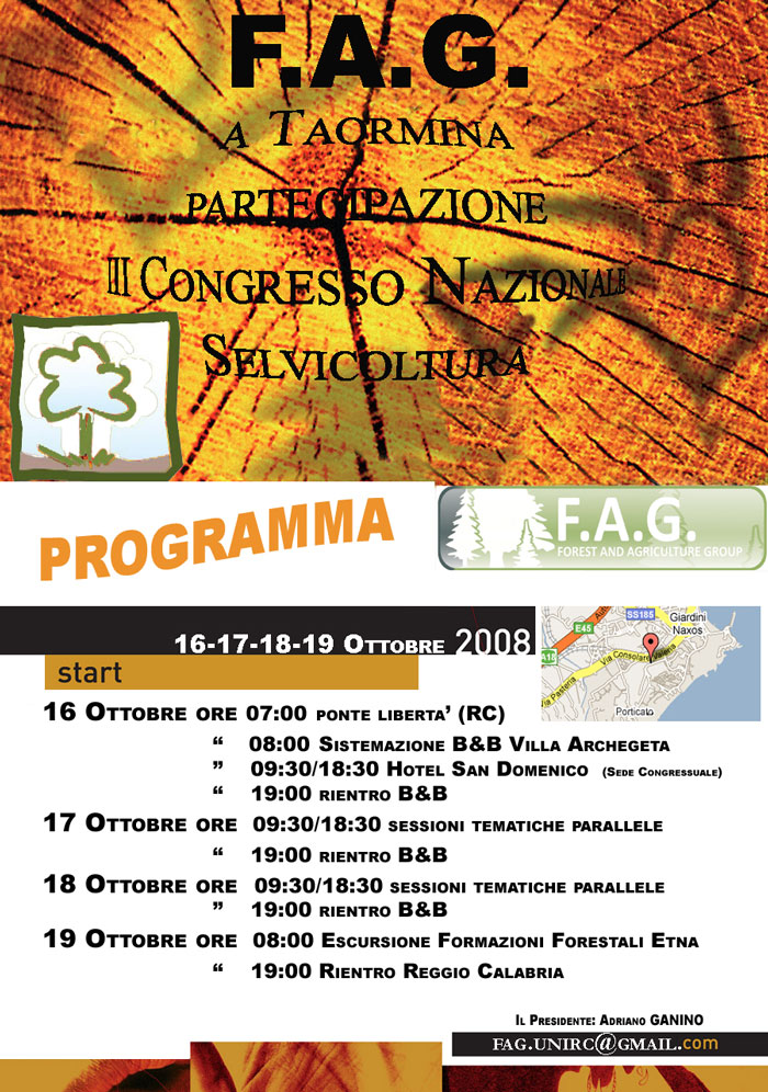 L'Associazione studentesca F.A.G., in collaborazione con il Consiglio degli Studenti, i rappresentanti della Facoltà di Agraria e le associazioni iscritte alla Mediterranea, organizza un viaggio studio a Taormina nei giorni 16/19 ottobre per la partecipazione al III Congresso Nazionale di Selvicoltura.