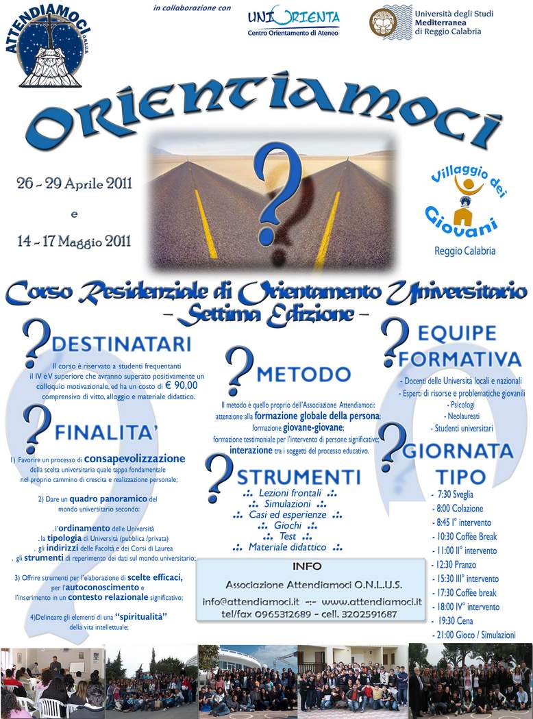 Il Campus di Orientamento Universitario e metodologia alla scelta avrà carattere residenziale e sarà realizzato in due date dal 26 al 29 aprile e dal 14 al 17 maggio 2011 presso il Villaggio dei Giovani dell’Associazione Attendiamoci O.N.L.U.S in loc. Ragaglioti - Reggio Calabria.