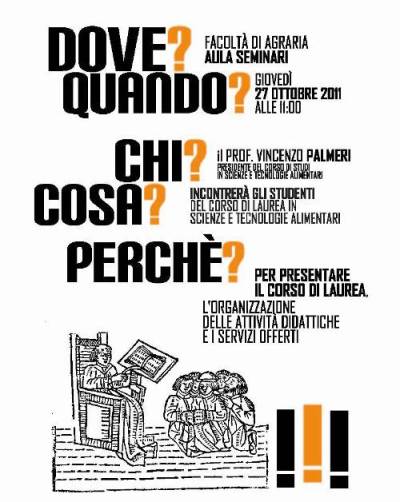 Giovedì 27 ottobre 2011 alle ore 11.00 presso l'aula seminari della Facoltà di Agraria il Presidente del Corso di Studi in Scienze e Tecnologie Alimentari incontra le Matricole e gli Studenti dei Corsi di Laurea Triennale e Magistrale, per presentare il corso di laurea, l'organizzazione delle attività didattiche e i servizi offerti