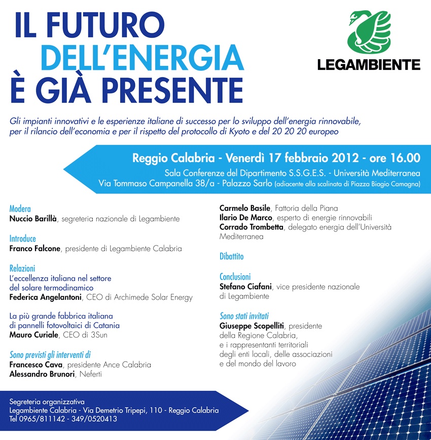 17 febbraio Convegno Il futuro dell’energia è già presente organizzato da Legambiente